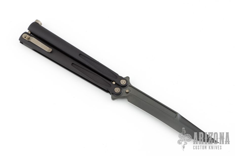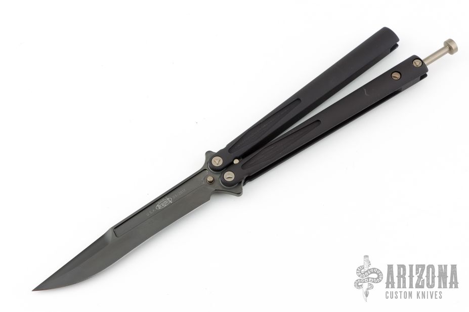 This Tachyon III balisong by Microtech Knives has a DLC finished blade with false top edge. The handles are integral black aluminum with spring latch and tip up stainless steel clip, bronzed hardware. Includes original box and papers. Dated 03/2017 and #01513. Comes with original box, papers and take down tool. New condition.
