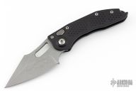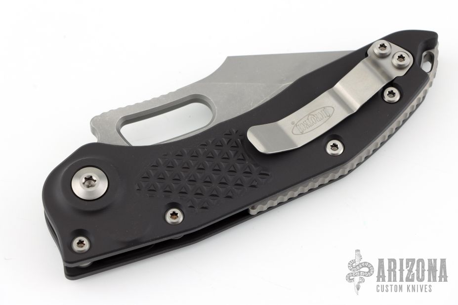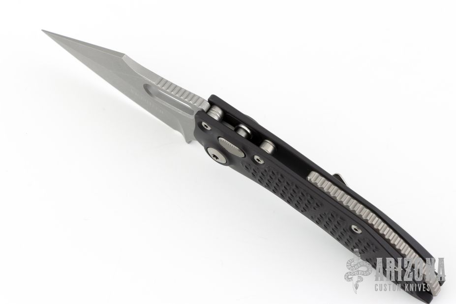 This Stitch Auto by Microtech Knives features an Apocalyptic finished blade and false top edge, notched thumb and finger rests. The handle has a black anodized and milled aluminum handle with a bead blasted titanium backspacer and a bead blasted stainless steel clip, tip up carry, lanyard hole at the butt. Comes with original box and. S/N of 1401 and dated 05/2017. New condition.