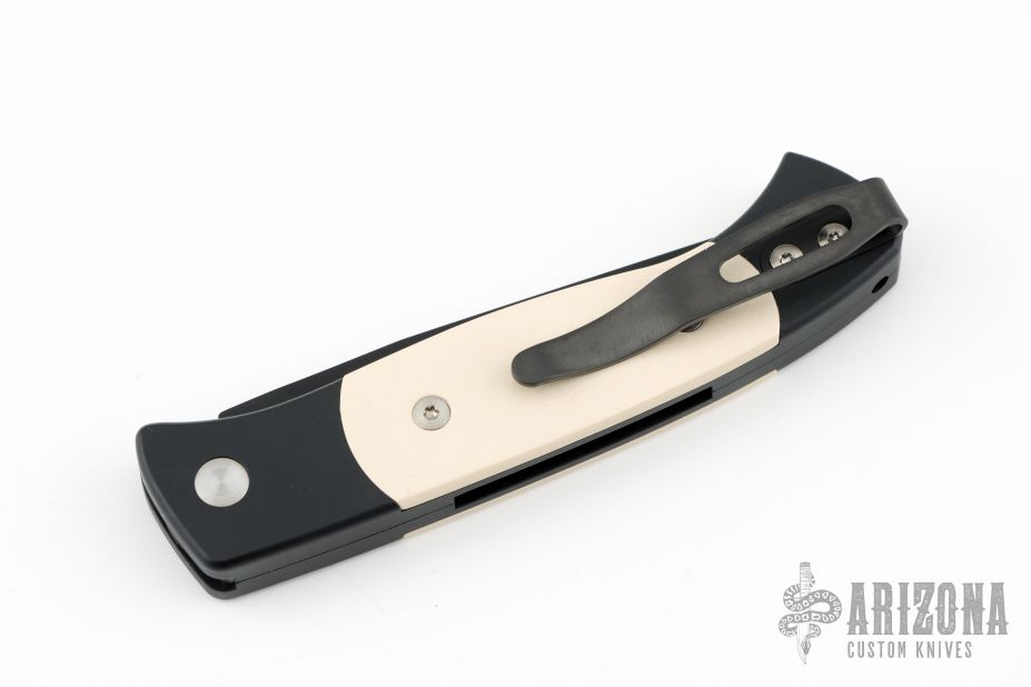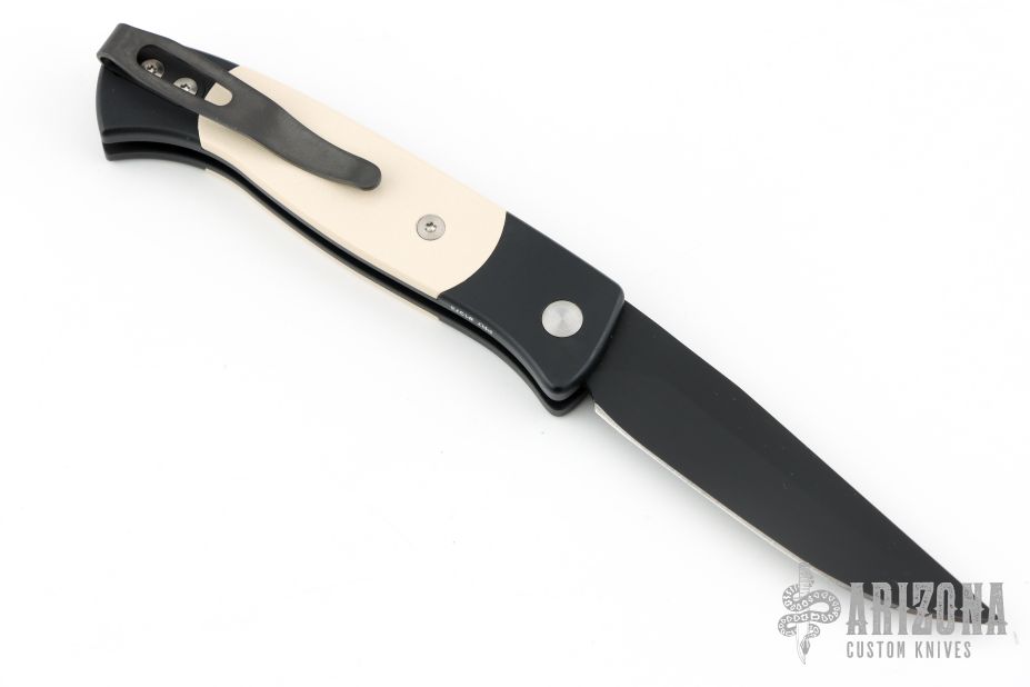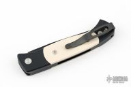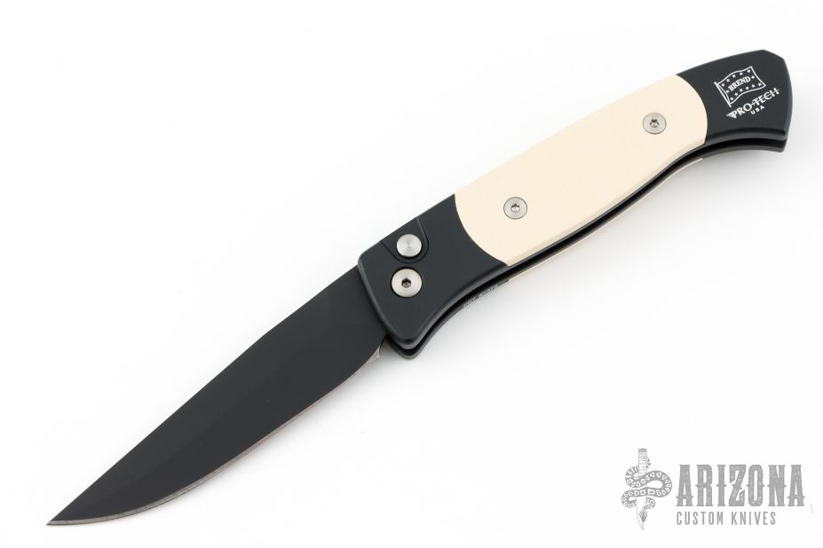 The Brend Auto by Pro-Tech Knives features Walter Brend's famous "Model 1" blade shape in a small package. Coil spring side-opening automatic. It has a black blade and black aluminum handle with ivory micarta inlays, tip up black stainless steel clip. New condition. PR7 #1373. Comes with original box and papers.
