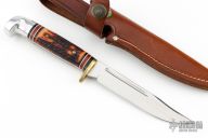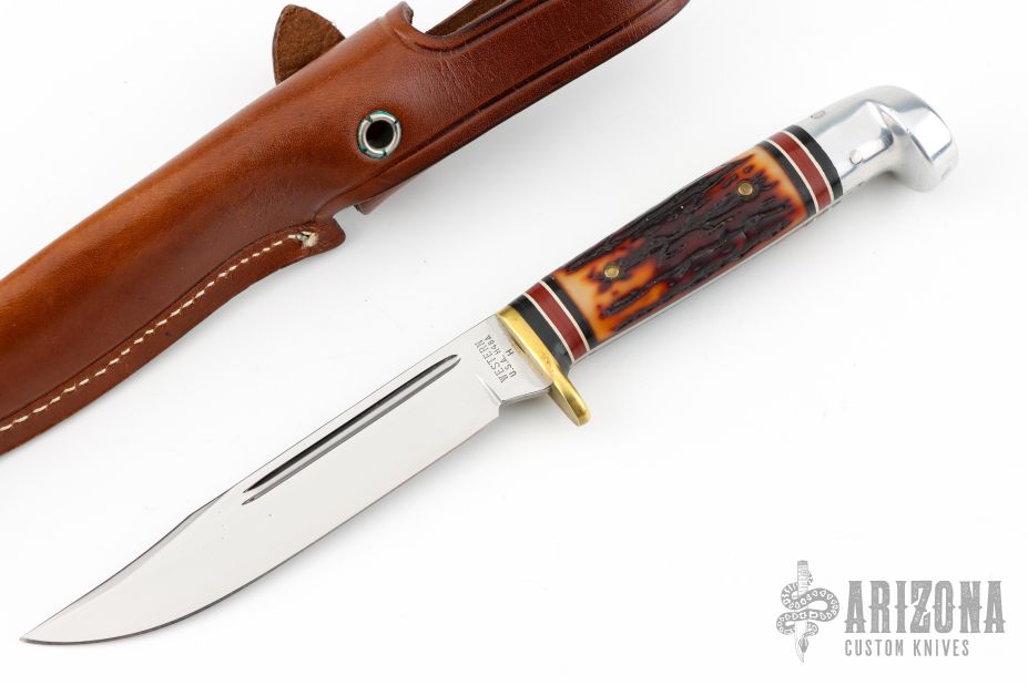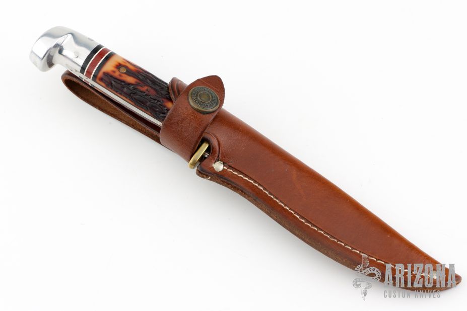 This knife by Western Cutlery features a mirror finished blade with fullers, .108" blade stock and .742" blade depth, full tang construction. The handle has a brass guard, faux stag scales, black/brass spacers and an aluminum butt. Comes with a brown leather sheath. Blade stamped "WESTERN U.S.A. H48A". Excellent condition.