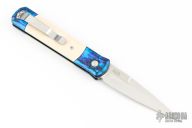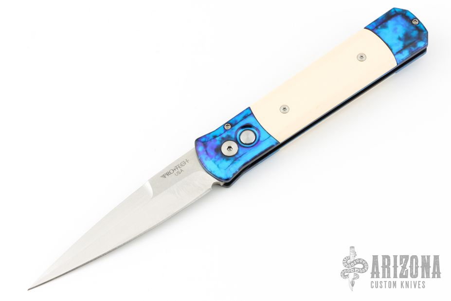 The Godfather 4" blade auto knife represents the influence of original Italian "Stilletto" style auto knife and Pro-Tech's modern coil spring precision.  This Godfather has a satin finish blade and anodized "Jazz" handle with ivory micarta inlays. Satin stainless steel clip. Has "11020037" on blade.  Includes original box and paperwork. Excellent condition.