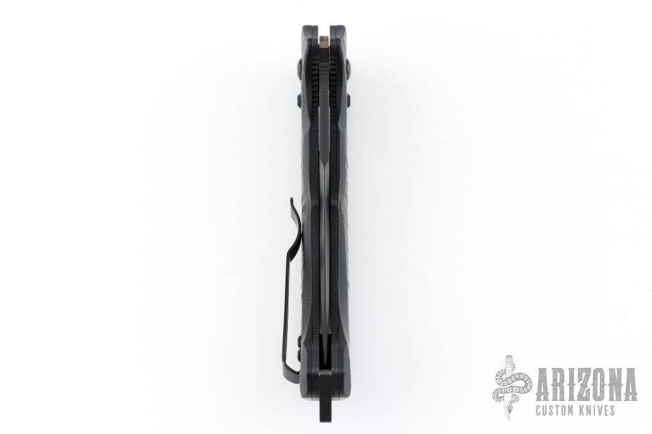 Well-balanced, symmetrical, eye-catching, The Bedlam has a black coated 154CM partially serrated blade that is released with the AXIS locking button. Safety on top of knife. Sculpted black G10 handle fits comfortably and securely. Reversible tip up black clip. Has a few light scuffs, otherwise excellent condition.