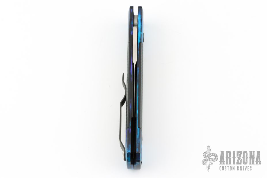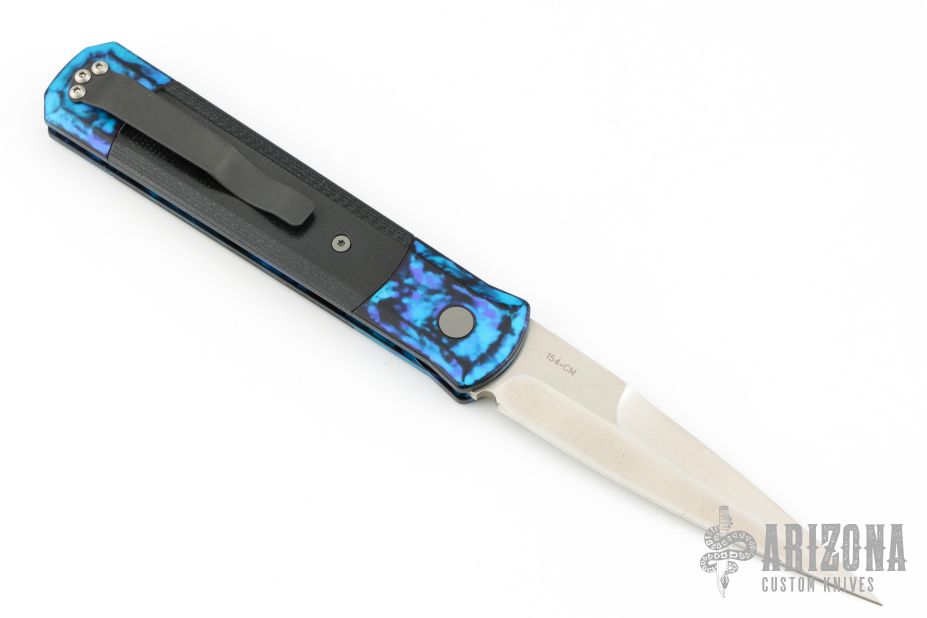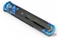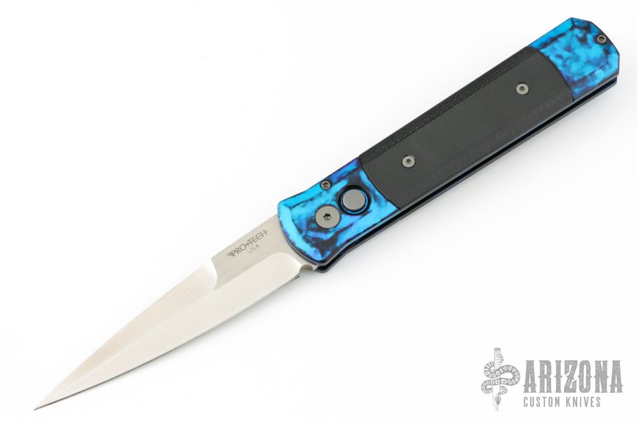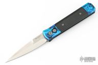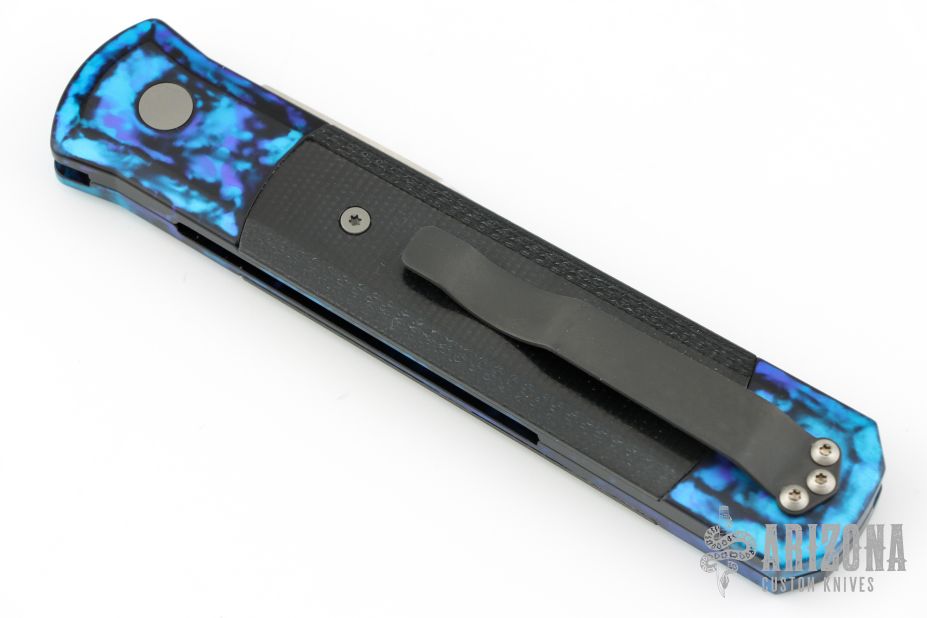 This Godfather Jazz by Pro-Tech Knives features a satin finished spear point blade with false top edge. The handle has a jazz anodized aluminum frame with black G-10 inlays and a tip up stainless steel clip. Comes with original box and papers. Excellent condition.