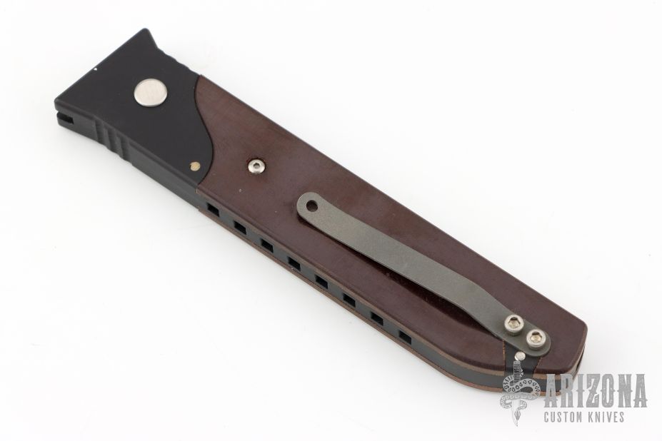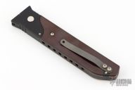 This Jammer side-opening automatic by Rob Dalton features a bead blast chisel grind blade and a black aluminum handle with a maroon linen micarta overlay. Bead blast titanium clip, tip up carry. Strong and fast coil-spring opening. Ha a couple scratches, otherwise excellent condition.