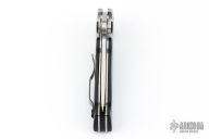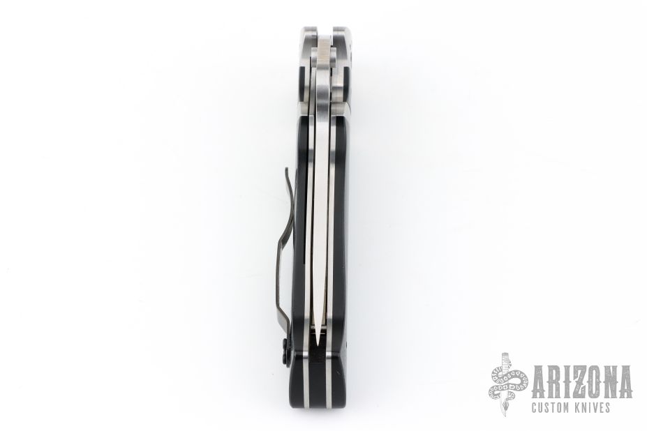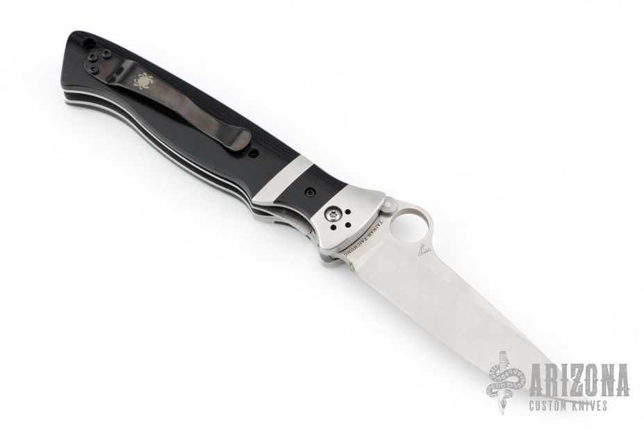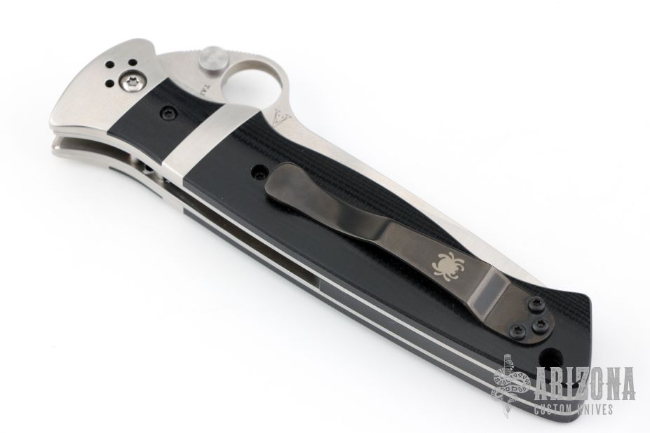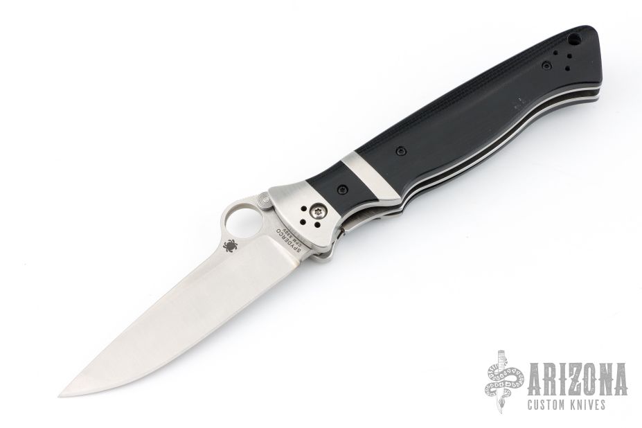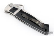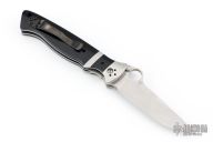 This Vallotton Sub-Hilt Auto by Spyderco was converted by Butch Vallotton, it features a satin finished S30V blade with a thumb-hole, dual thumb-studs, and notched thumbrest. The handle has stainless steel bolsters, black G-10 scales, stainless steel liners, black G-10 backspacer, and 4-way reversible black stainless steel clip. Nice detent, lockup and blade seating, but if you fire the knife, the kick spring gets in the way of the liner engaging the blade, a little more of the locking liner needs to be removed from the backside. Can be opened manually or as an auto. Besides it not locking when fired automatically, it is in excellent condition.
