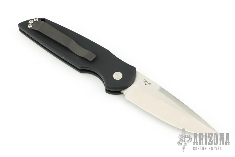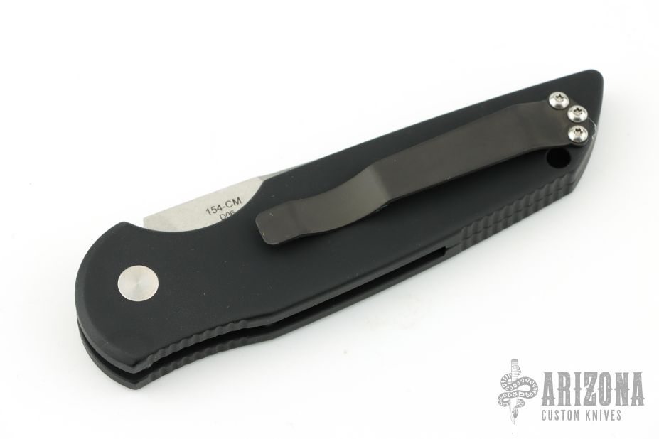 The Pro-Tech TR3 features a satin finished blade. The handle has a matte finished black aluminum frame with a non-slip rubber inlay and a black tip up stainless steel clip. Includes the original box and papers. Excellent Condition.