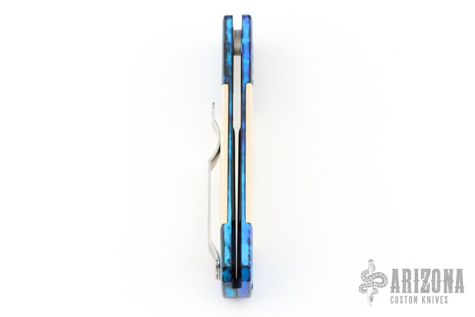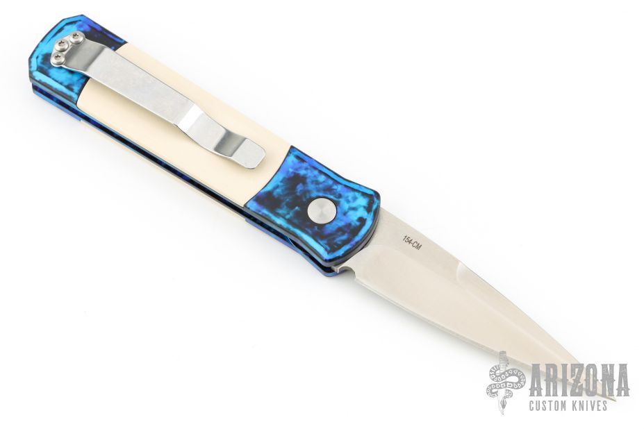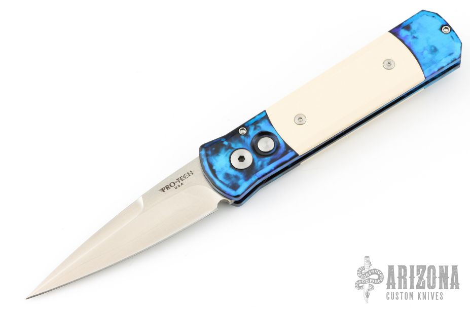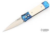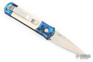 This Godson side opening coil-spring automatic features an anodized "Jazz" handle with ivory micarta inlays and a satin finish blade. Stainless steel clip. Includes original box and paperwork. Excellent condition.