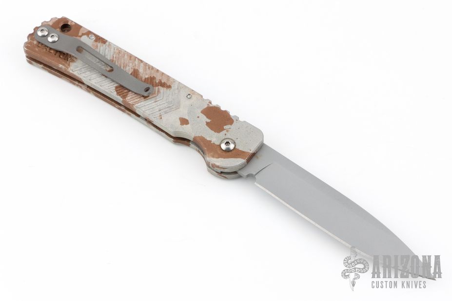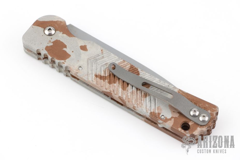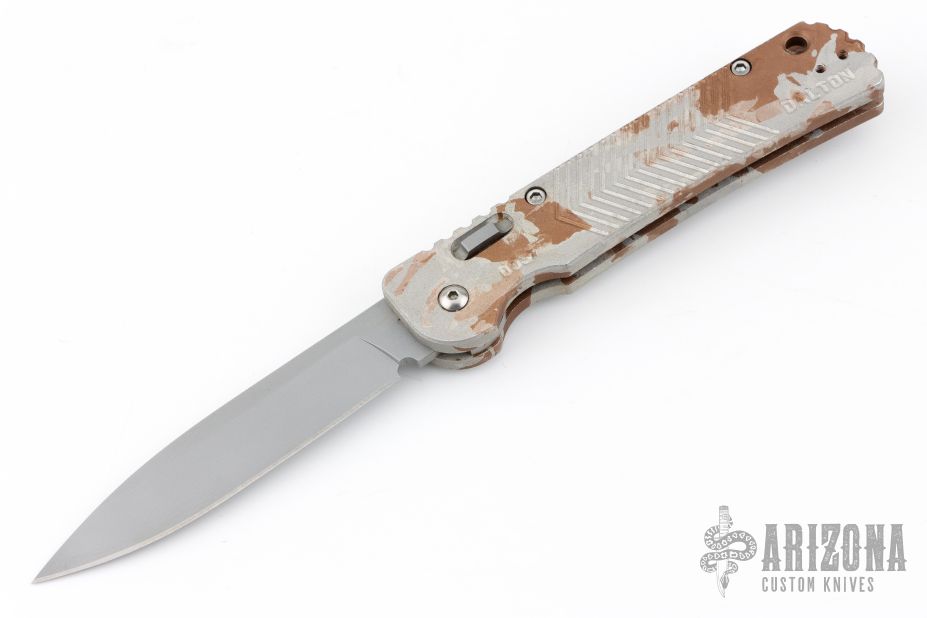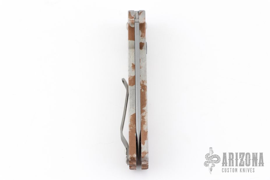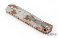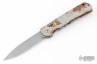 This Militia by Rob Dalton features a bead blasted drop point blade with swedge. The handle is comprised of a splash camo aluminum frame with bead blasted stainless steel pocket clip position for tip up carry, left or right reversible. Lanyard hole in pommel. S/N 0037. Has a couple light scuffs, otherwise excellent condition.