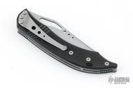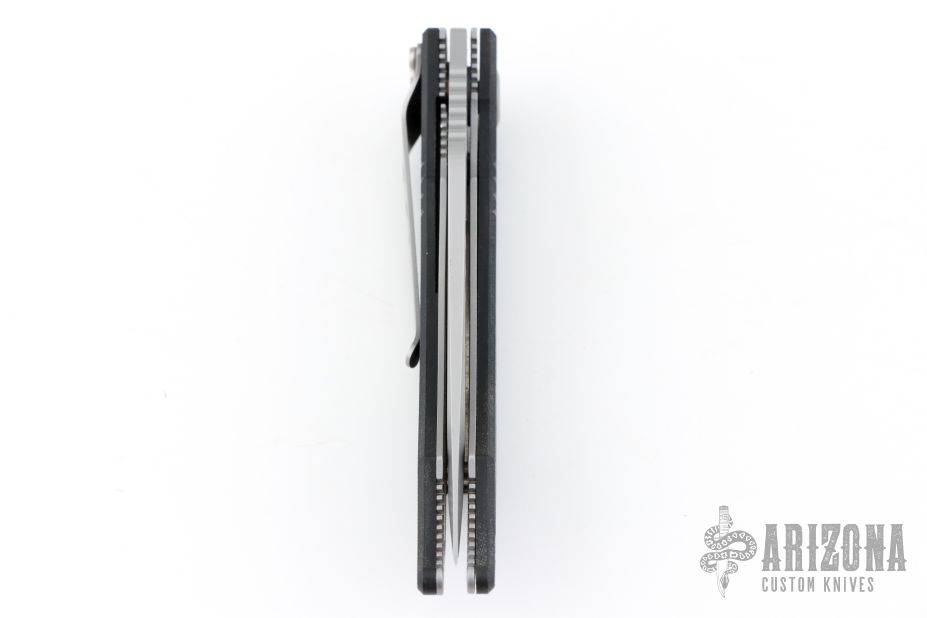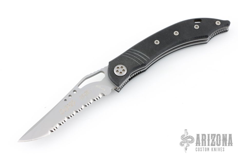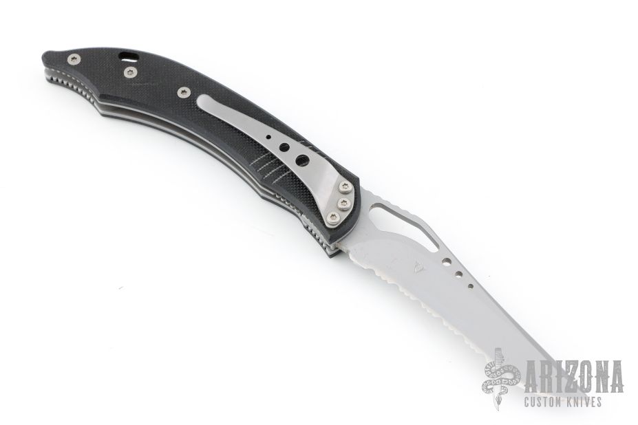 This is a Delta Z Osprey linerlock folder has been converted to a scale release auto by Butch Vallotton. It features a bead blasted fully serrated tanto recurve blade with thumbhole and notched thumbrest. The handle has black G-10 scales, stainless steel liners and tip down clip. Excellent condition.