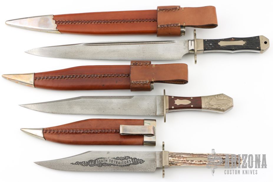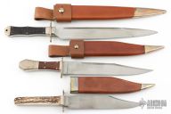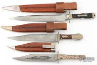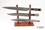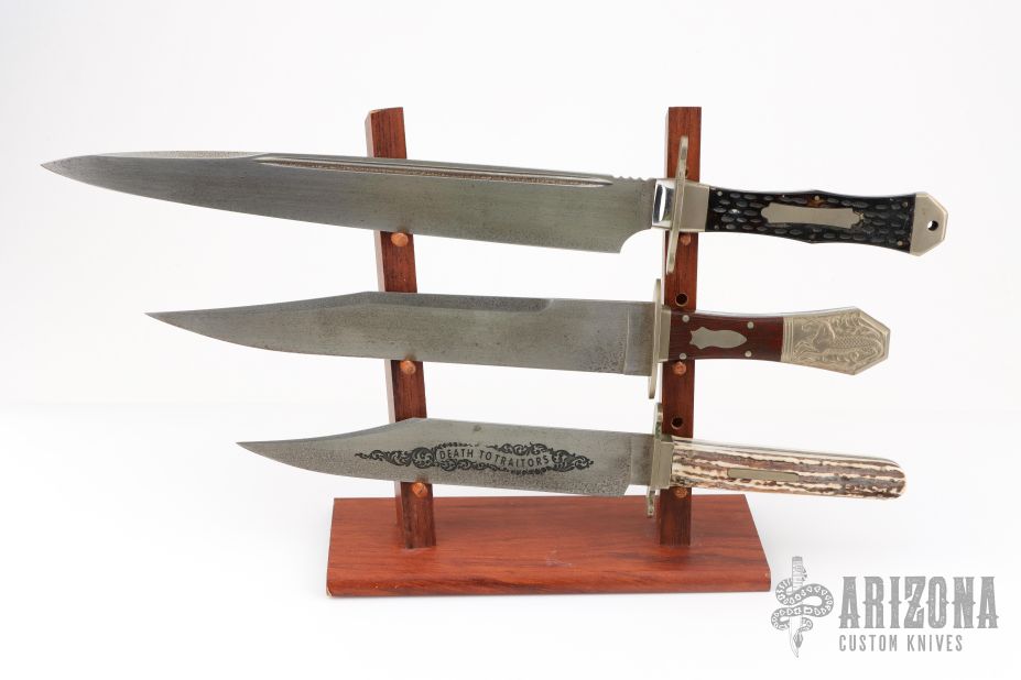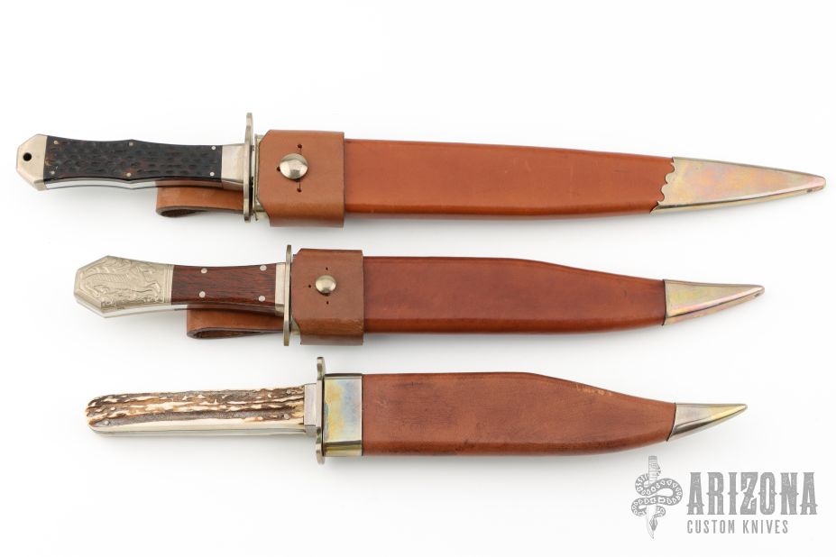 These reproduction Sheffield Bowies by Paul Chen, Dalian and Hanwei features a hand rub satin finished blades full tang construction. The handles have nickel silver guards, with stag, rosewood and jigged bone scales, nickel silver fittings. All three come with original brown leather and nickel silver scabbards. Comes with a wooden stand that holds all three knives. The knives all have oxidation on the blades and patina, but are unused and in good condition otherwise.