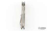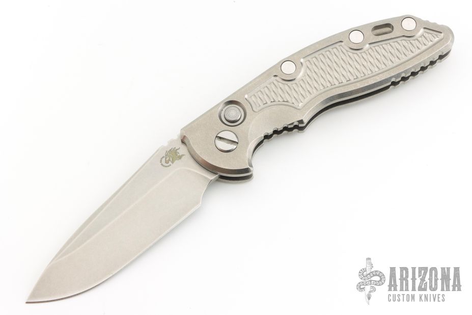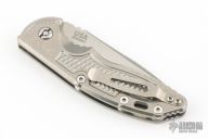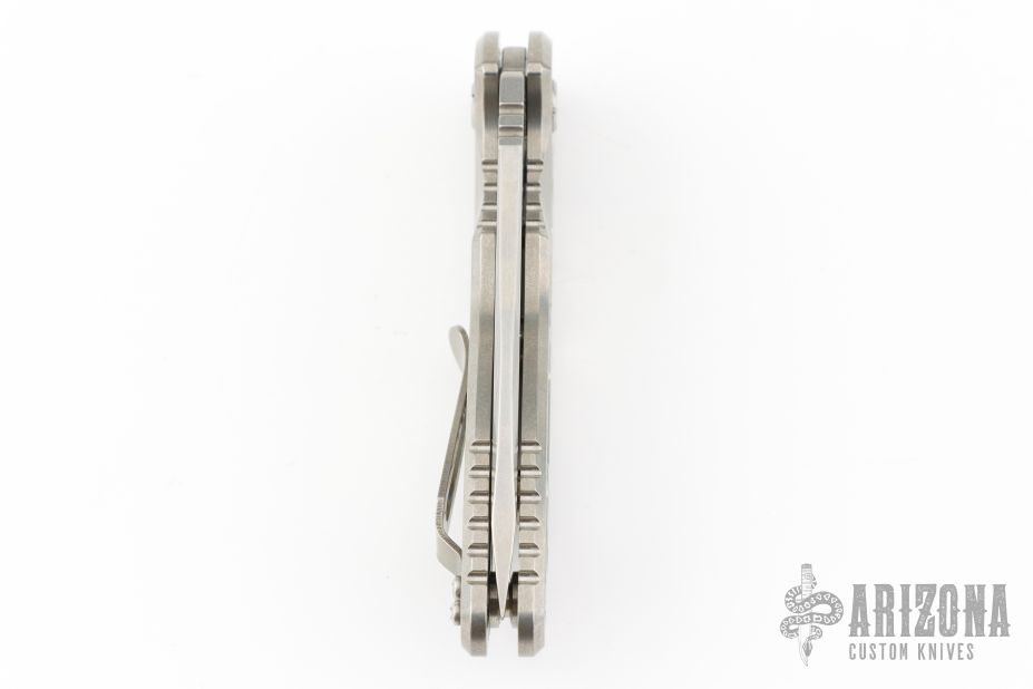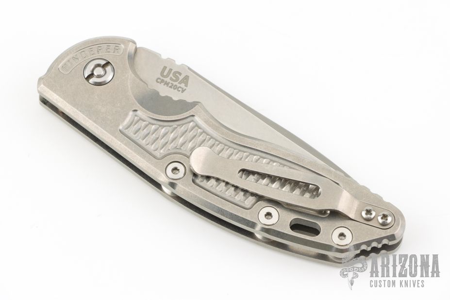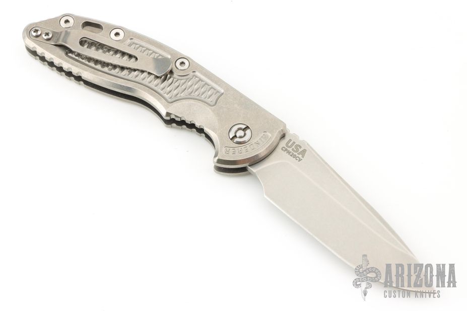This XM-18 Flipper by Rick Hinderer Knives features a 3.5" stonewashed finish blade, notched thumbrest and flipper.  The handle has a stonewashed titanium frame with a matching tip up pocket clip.  Includes original box and papers. Excellent condition.
