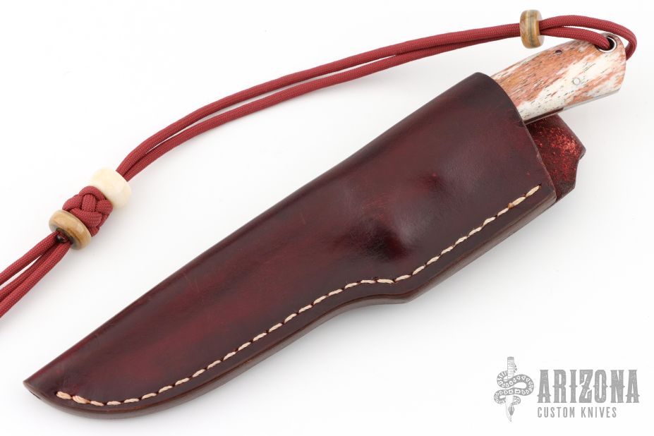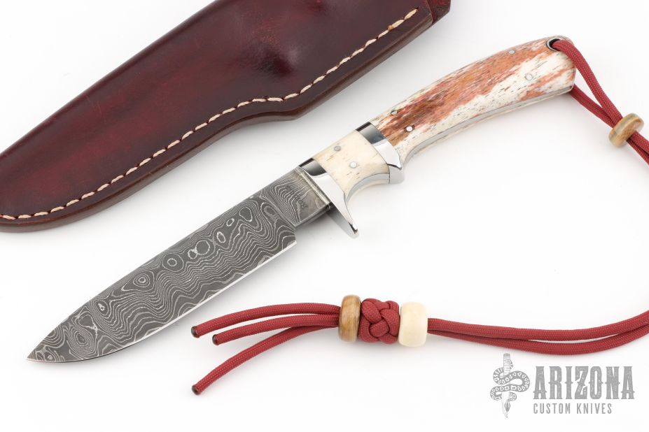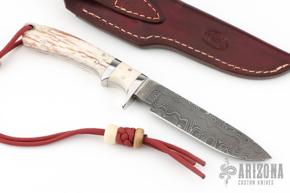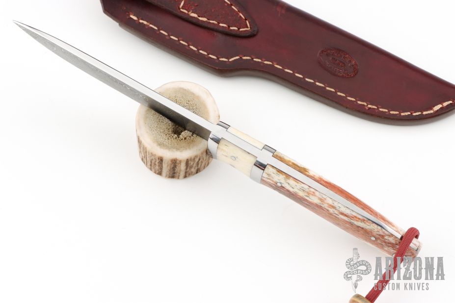 This knife by Gordon Romeis features a Damascus blade with .164" blade stock and 1.082" blade depth, tapered tang construction. The handle has a steel guard, steel sub hilt, steel spacer, pinned giraffe bone segmented covers. The lanyard beads are giraffe bone and Siberian mammoth ivory. Comes with a brown leather belt sheath. Excellent condition.