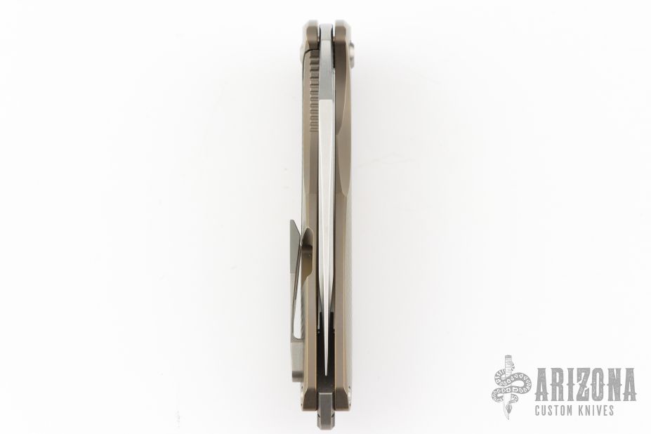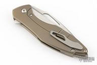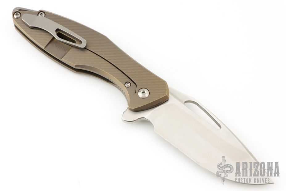 This Arius by Koenig knives features a Brightwashed w/ PF finished blade with thumbhole and flipper. The handle has a Corda Patterned and anodized titanium frame with a stonewashed titanium tip up clip, stonewashed titanium backspacer. Has ceramic bearings and a ceramic detent ball. Nice detent, lockup and blade seating. Comes with original box and COA dated June 16, 2023. Excellent condition.