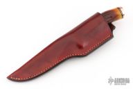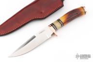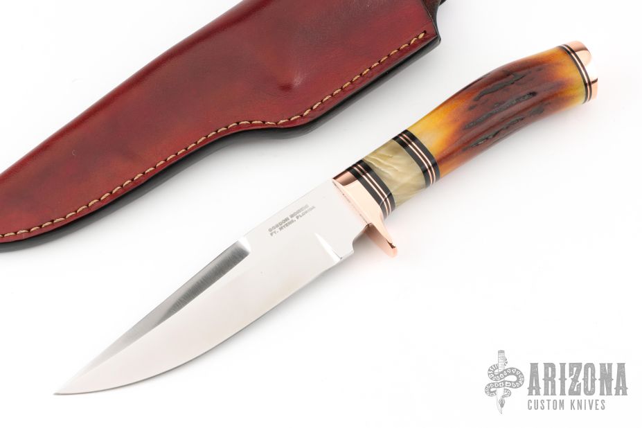 This knife by Gordon Romeis features a satin finished blade with a false top edge, .191" blade stock and 1.25" blade depth, hidden tang construction. The handle has a copper guard, black/copper spacer pattern, with musk ox, and amber stag grip. Copper pommel cap. Comes with a brown leather belt sheath. Excellent condition.