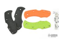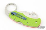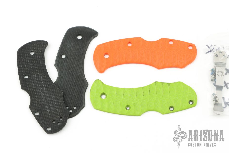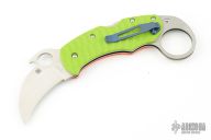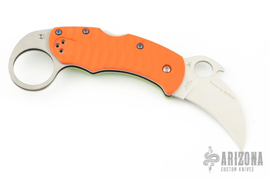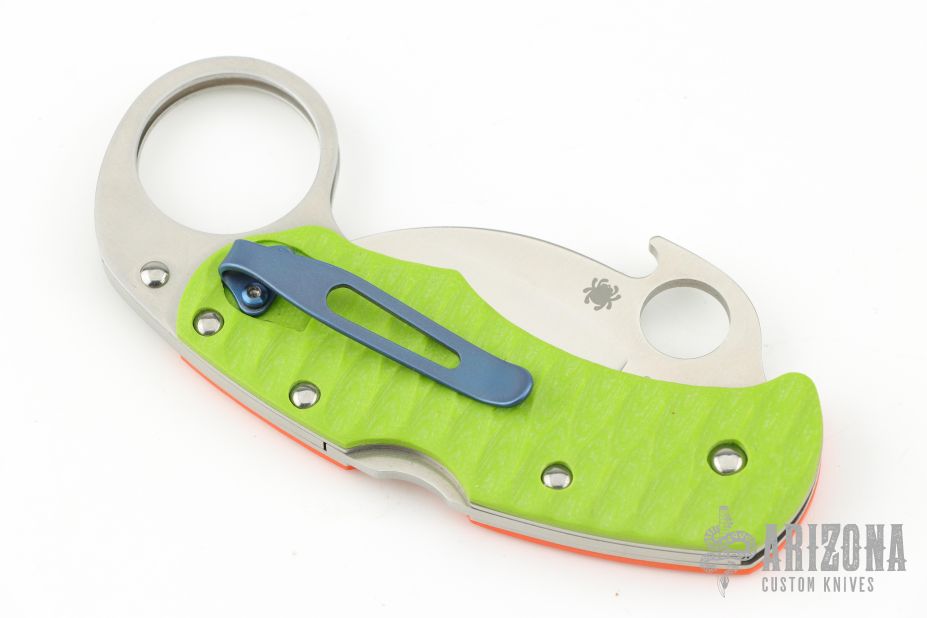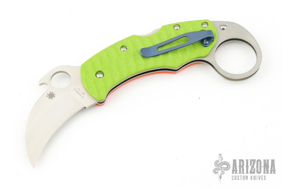 This Karahawk by Spyderco features a satin finished hawkbill blade with thumbhole and wave feature. The handle has G-10 scales with stainless steel liners and backspacer, tip up anodized titanium deep carry clip, left or right reversible. Comes with a zippered case, original clip, original set of black G-10 scales, and an extra green and orange G-10 scale. It is currently wearing one orange and one green. Excellent condition.