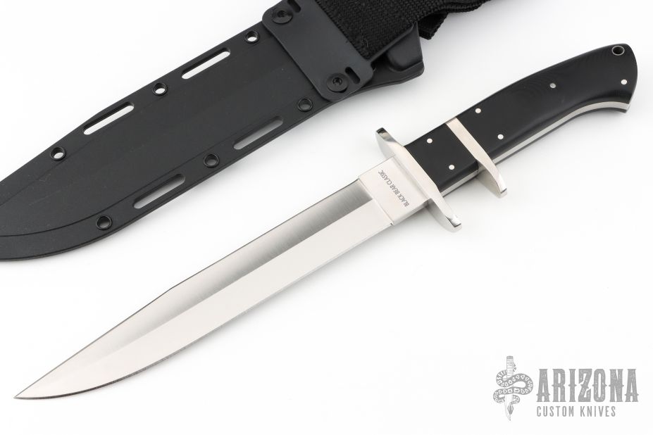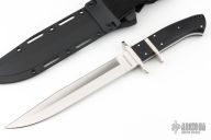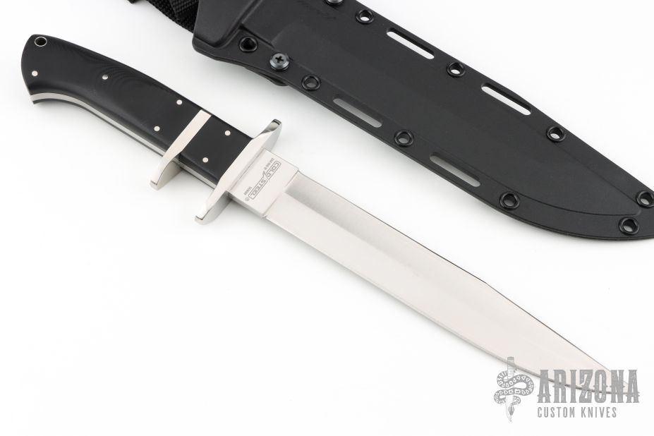 This Big Bear Classic from Cold Steel features a double edged clip point satin finished SAN MAI blade, .196" blade stock and 1.185" blade depth, full tang construction. The handle has a stainless steel double guard and sub-hilt, black linen micarta scales and lanyard tube. Comes with a black kydex sheath and original box. Excellent condition.