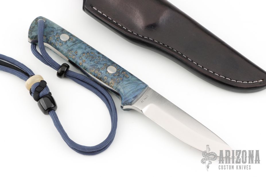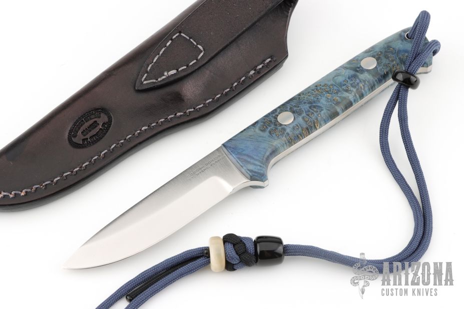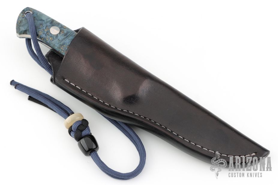This knife by Gordon Romeis features a satin finish blade with .176" blade stock and .94" blade depth, full tang construction. The handle has black ash covers with mosaic pins. The lanyard beads are buffalo horn, and musk ox. Comes with a brown leather belt sheath. Excellent condition.