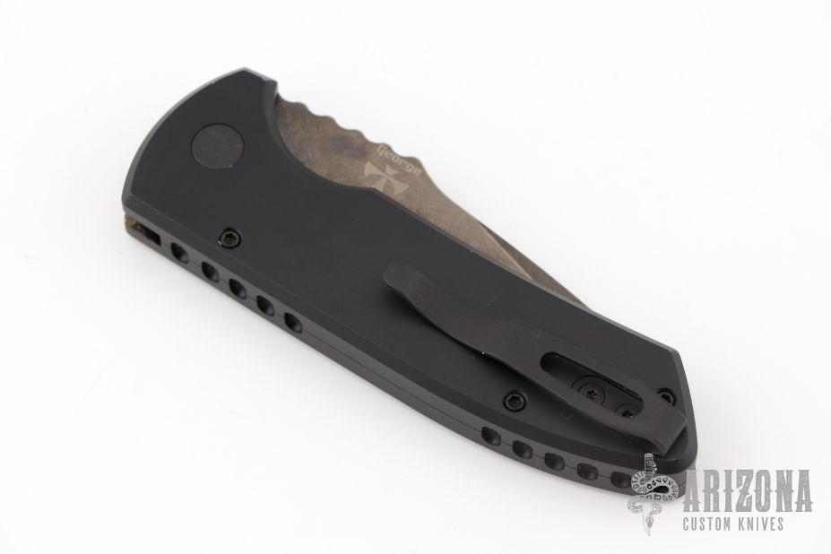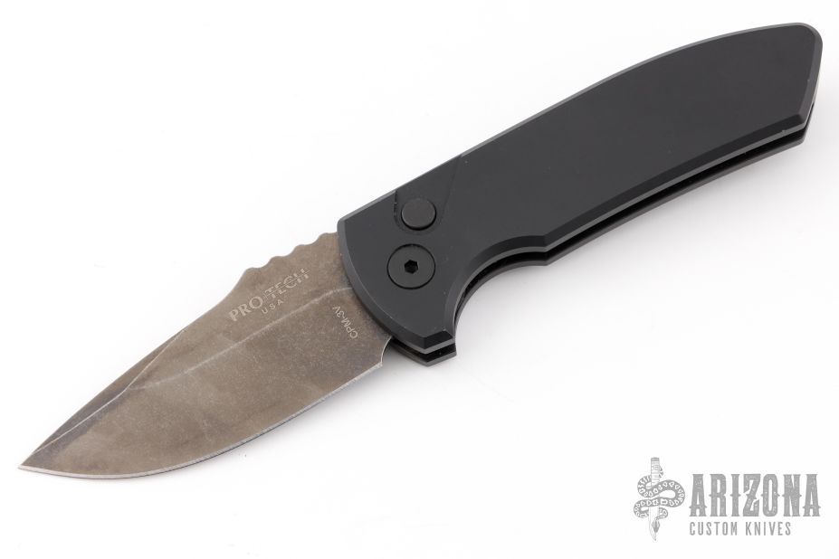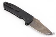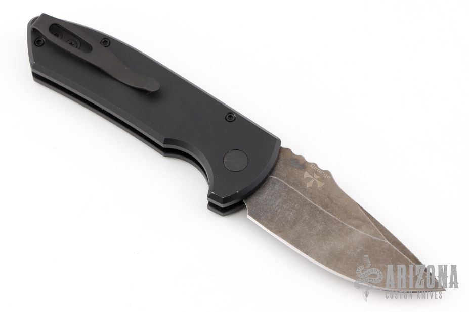The Protech Knives SBR (Short Bladed Rockeye) is a utilitarian, compact, every-day-carry version of the Les George iconic Rockeye model, retaining the classic design in a smaller package. The SBR has the same American innovations as the Rockeye, featuring modern materials, high-tech manufacturing, advanced coil spring mechanism, and quality American production. This version of the SBR has a DLC black washed blade, black anodized aluminum handles and black hardware.  Includes the original box and papers. Has a couple light marks on the frame, otherwise excellent condition.