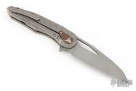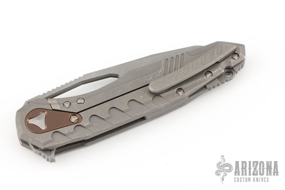 This Sigil MK6 by Microtech Knives features an Apocalyptic finished blade with thumb hole and flipper, notched thumbrest. The handle has an Apocalyptic finished titanium frame, tip up clip and backspacer with a distressed copper overtravel stop, stainless lockface insert. Comes with original box and papers. S/N 0763 and dated 04/2017. Excellent Condition.