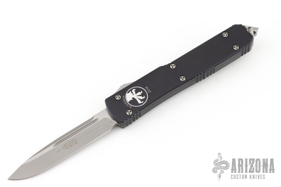 This Ultratech by Microtech is the 2016 Blade Show Special. It features an Apocalyptic finished blade. The handle has a black aluminum frame with blasted stainless hardware and tip up clip. From the 2016 Blade Show. Has a couple light scuffs, otherwise Excellent condition. Comes with original box and papers.