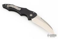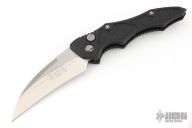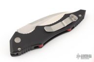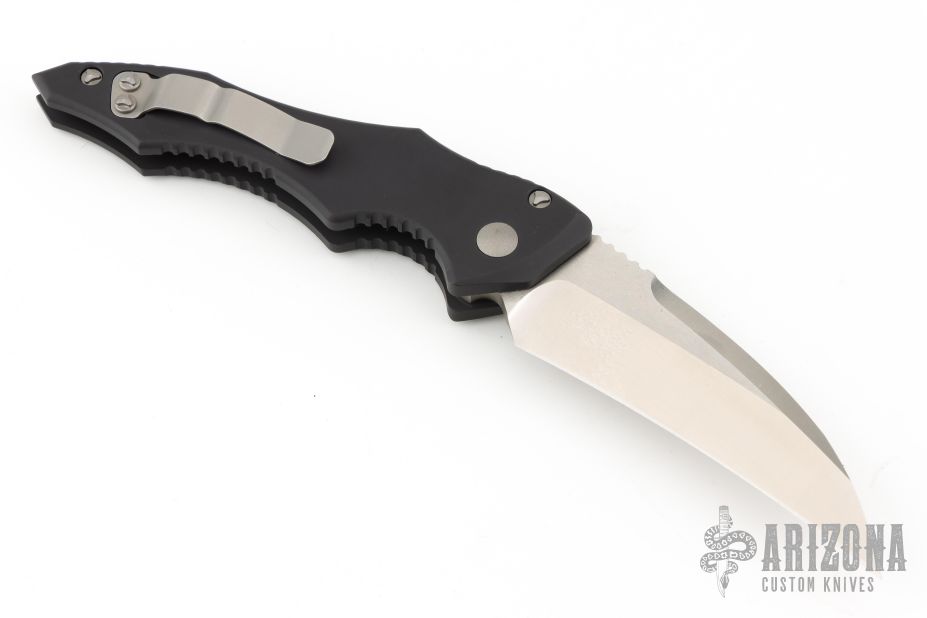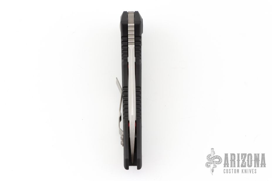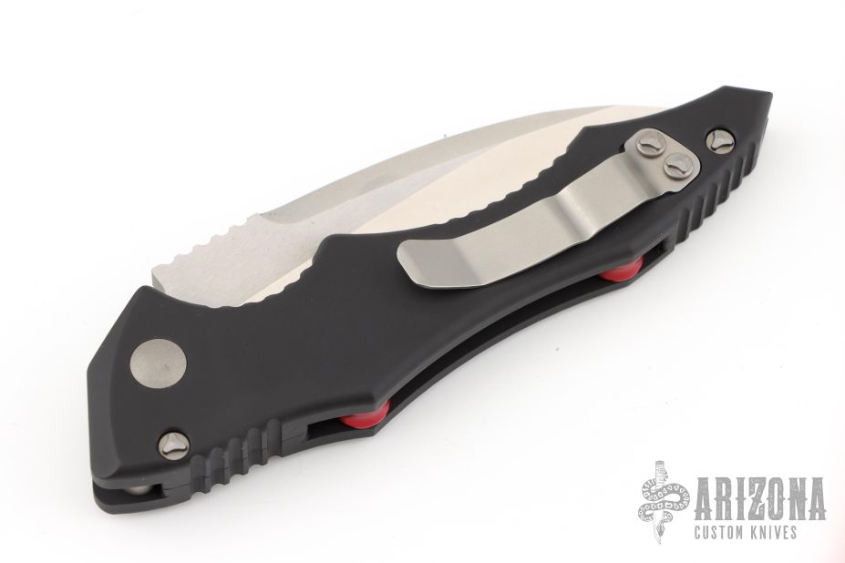 This Kestrel by Microtech is a side opening automatic has a satin finish blade with a standard edge and a black aluminum frame with non-slip inlays and red posts. Stainless steel clip, tip up carry. Dated 02/2011 and s/n 00479. Comes with original box, papers, and nylon sheath. Has a couple light scratches on the body, excellent condition otherwise.