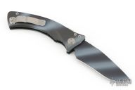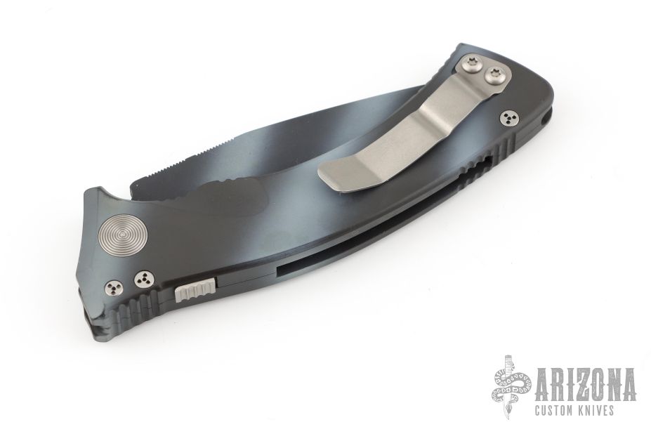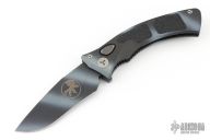 This Amphibian Auto has a Camo finished clip point recurve blade with notched thumb rest. Handle is Camo and black finished aluminum with nonslip inserts and bead blasted stainless steel tip up clip. Dated 03/2004. Includes original box, papers and nylon sheath. Has a couple light scuffs and scratches otherwise Excellent Condition.