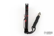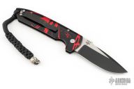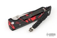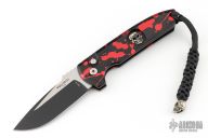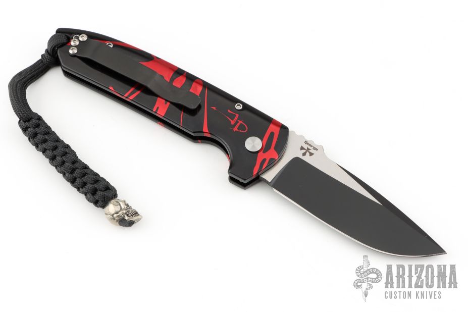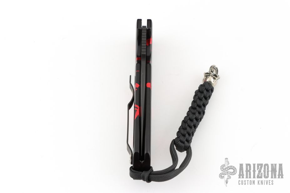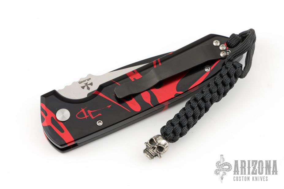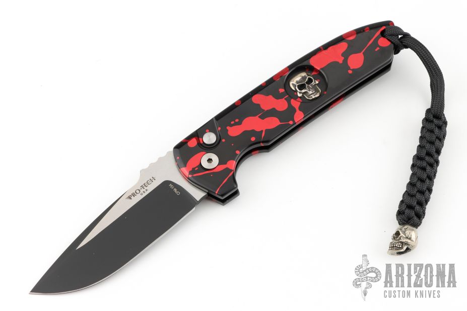 This Rockeye Auto has a two-tone blade with satin flats and notched thumbrest. The handle is red/black splash anodized aluminum with a Bruce Shaw designed sterling silver skull inset, black finished stainless steel tip up clip, and lanyard hole. Typical flawless Protech mechanics and blade seating. Excellent/new condition, comes with original box, sheath and papers.