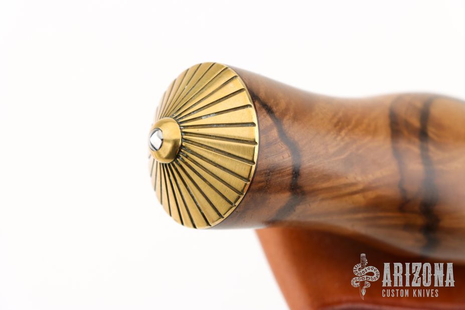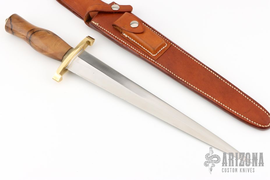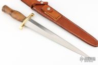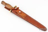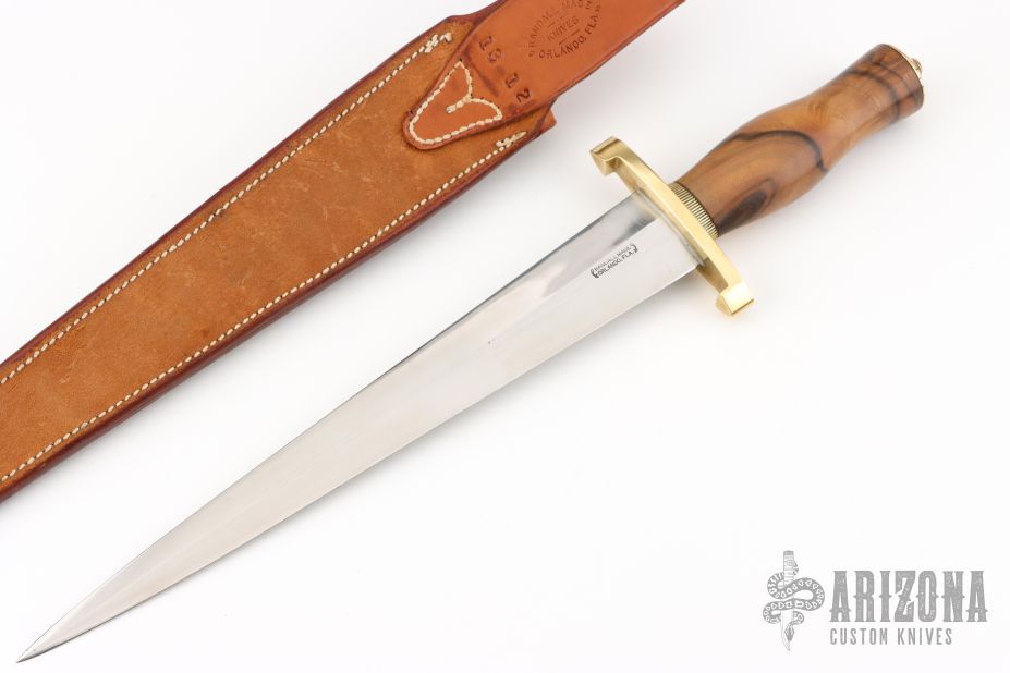 This Model 13-12 Arkansas Toothpick by Randall Made Knives features a satin finished carbon steel double edged blade with .244" blade stock and 1.658" blade depth, hidden tang construction. The handle has a lugged brass guard and scalloped butt, walnut grip with black spacers. Comes with a brown leather sheath. Has a couple small oxidation spots on the blade, otherwise excellent condition.