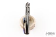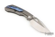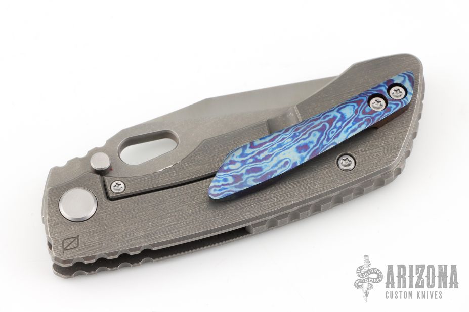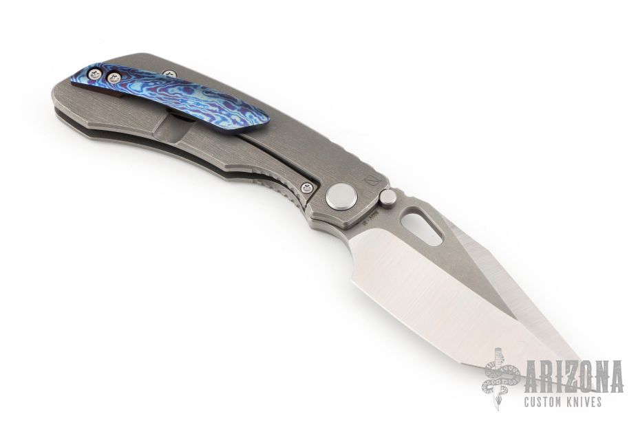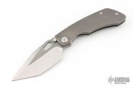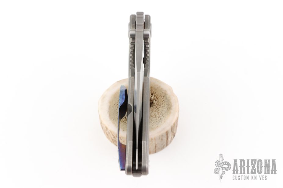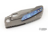 This Evolution 4.0 by Custom Knife Factory features a satin finished tanto blade with notched thumbrest and thumbhole. The handle has a bark finished titanium frame with a backspacer with a MokuTi tip up pocket clip. Comes with velcro case, origianl titanium clip, extra hardware, and COA #81 dated 1-24. Nice detent, lockup and blade seating.  Excellent condition.