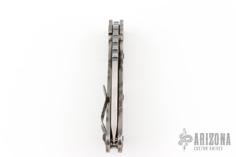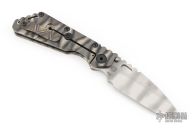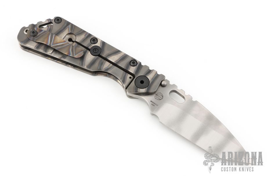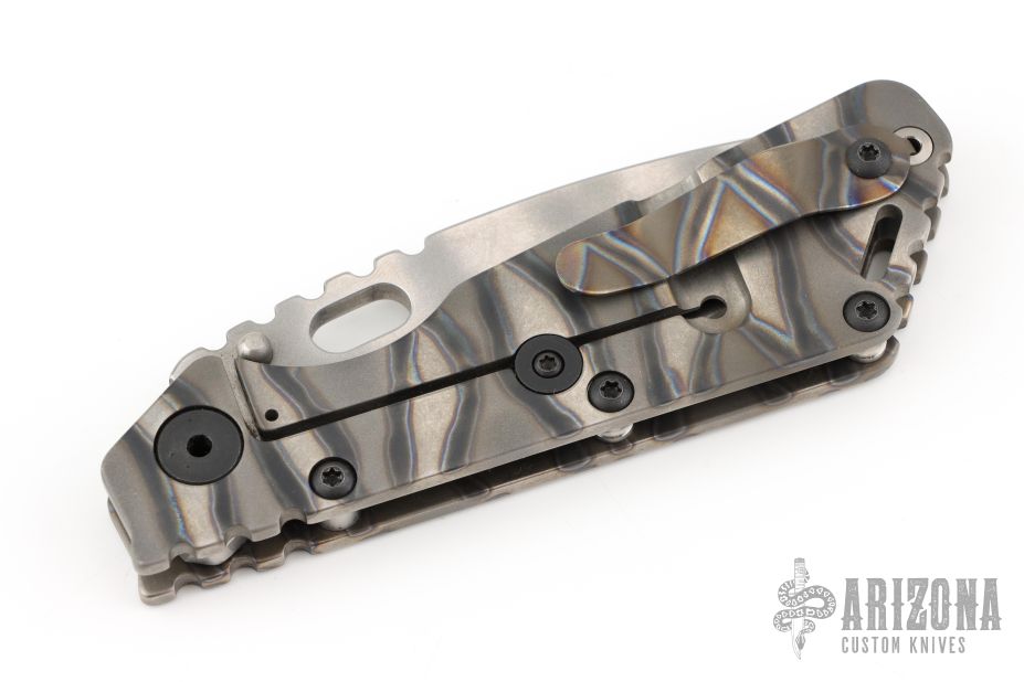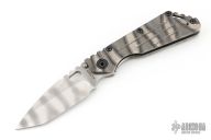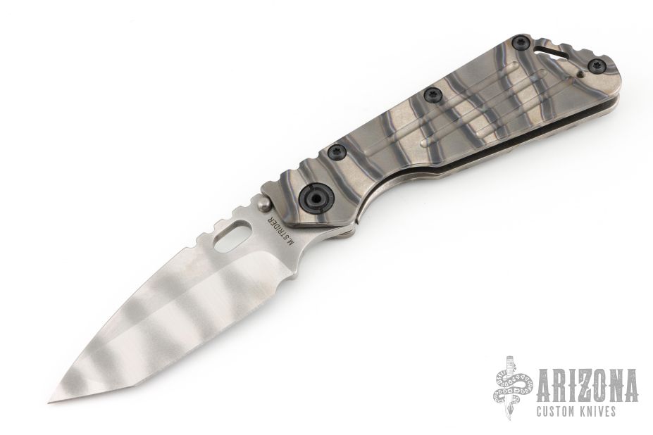 This Mick Strider Performance Series SMF framelock folder features a ghost stripe tanto blade with thumbhole and notched thumbrest. The handle has a Disruptive Strider Striped titanium frame with titanium clip, tip up carry. Jimping on blade spine. Includes Hinderer "Lock Bar Stabilizer" for maximum reverse lock retention. Nice detent, lockup and blade seating. New condition.