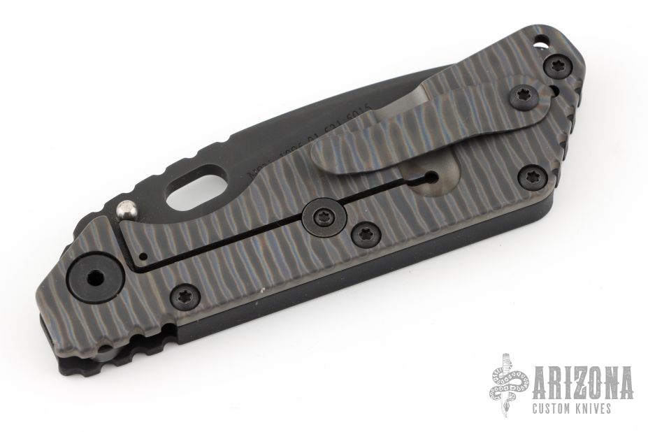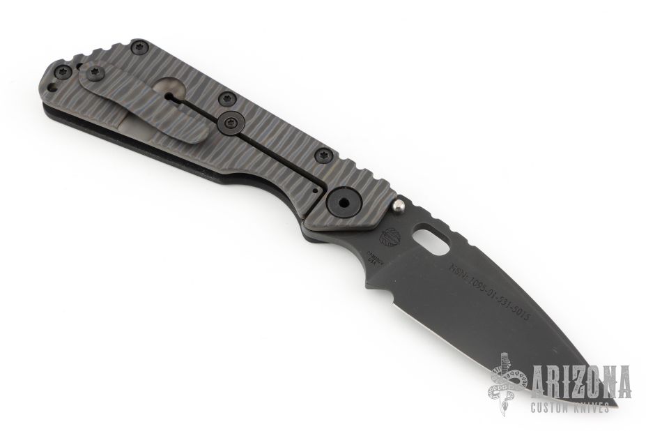 This Mick Strider SMF Fatty framelock folder features a black blade with thumbhole and notched thumbrest. The handle has a black aluminum and flame finished titanium frame with titanium clip, tip up carry. Jimping on blade spine. Nice lockup, detent, and blade seating. NSN: 1095-01-531-5015. Excellent condition.