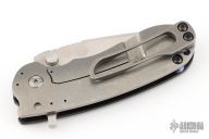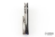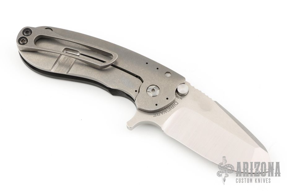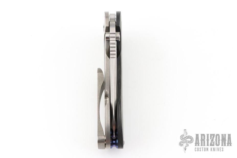This S-96 framelock flipper from Direware Knives features a satin finished blade with flipper tab. Smooth flipping action that requires no wrist movement with a strong lock up, nice detent and blade seating. The handle has a marble carbon fiber and stonewashed titanium frame, and matching pocket clip positioned for tip up carry, anodized titanium barrel spacers. Excellent condition.