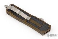 This Scarab OTF auto by Microtech Knives has an S/E blade with a stonewash finish. The handle is olive drab aluminum with a single glass breaker. Dated 11/2015, serial number 15236. Includes original box and papers. Excellent condition.