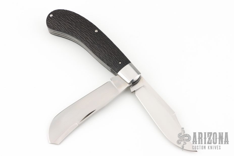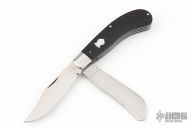 This Slipjoint by Tim Robertson features two hand rub satin finished blades with nail nicks. The handle has stainless steel bolsters, jigged black paper micarta covers, stainless steel escutcheon, liners and springs. Has half-stop, flush in all positions. Comes with a zippered case and a brown leather slip sheath by Robertson Leather Works. Excellent condition.