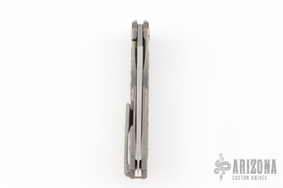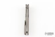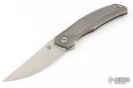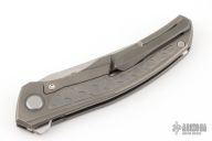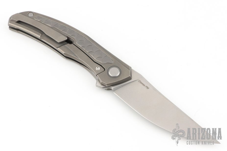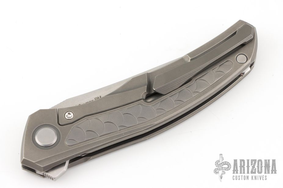 This Quantum Dragon by Shirogorov features a tumble finish blade with notched thumbrest and flipper. The handle has a blasted and milled titanium frame, tip up titanium clip with hidden screws. Rides on MRBS, nice detent, lockup and blade seating. Cromax PM blade steel. Comes with original box and COA.  Excellent condition.