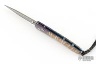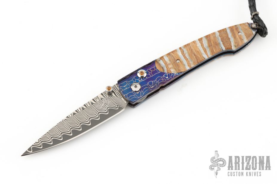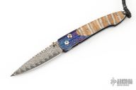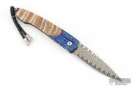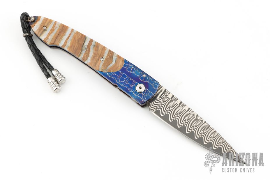 This B10 by William Henry features a 'Wave' Damascus w/ ZDP-189 core blade with a Spessartite inlaid thumbstud. Very nice heat blued Chad Nichols Croc Skin Damascus frame with mammoth tooth scales. The stone inlays on thumbstud and button lock are spessartite. Comes with original box, sheath and COA dated July 1, 2014. Excellent condition.