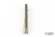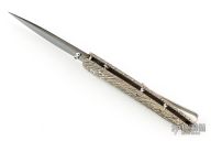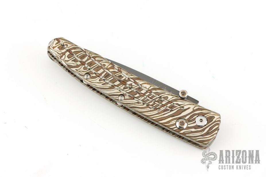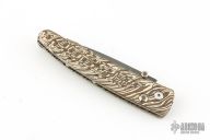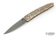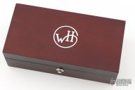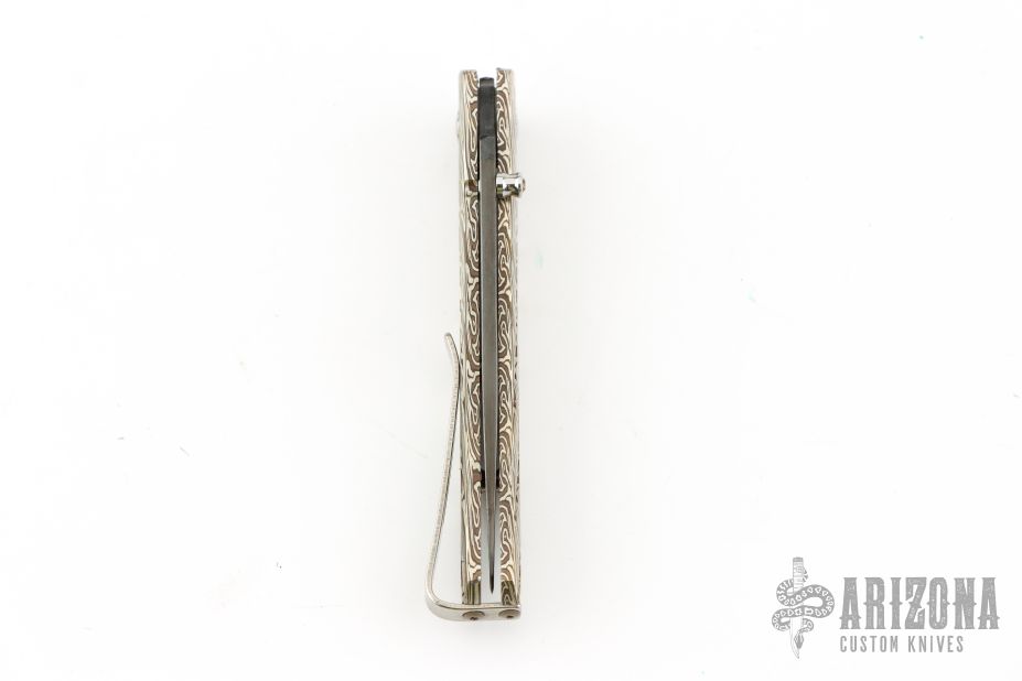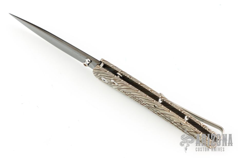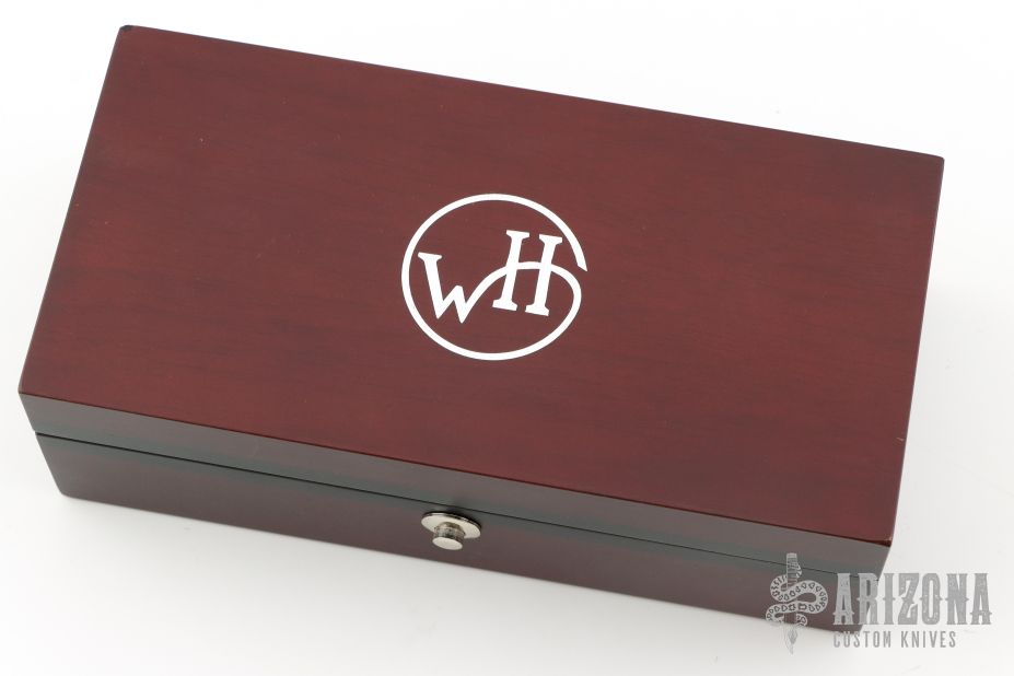 This B10-1119 Magellan from William Henry features a drop point blade made from Black Tungsten DLC coated "Wave" San Mai Damascus with ZDP-1869 Core. The titanium thumb stud features a Smokey Quartz inset. The handle is comprised of milled Mokume with a titanium button lock with Smokey Quartz inset. Barrel spacers and reversible tip down pocket clip are titanium. Like new condition. Comes with original papers, box and wooden presentation case.
