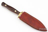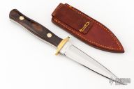 This custom Dagger by Weldon Whitley features a mirror polished double edged blade with .188" blade stock and .964" blade depth, full tang construction. The handle has a brass guard, wood grain micarta scales with white liners/spacers. Includes a brown leather sheath. Has a couple light scratches, otherwise excellent condition. #129