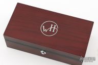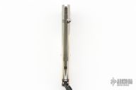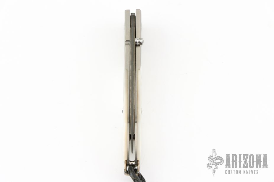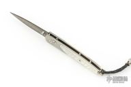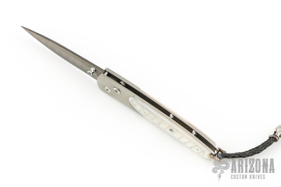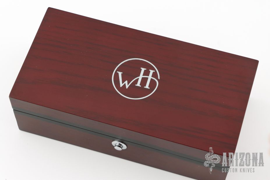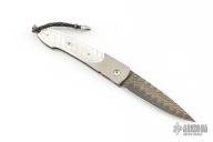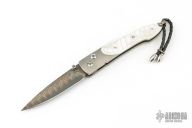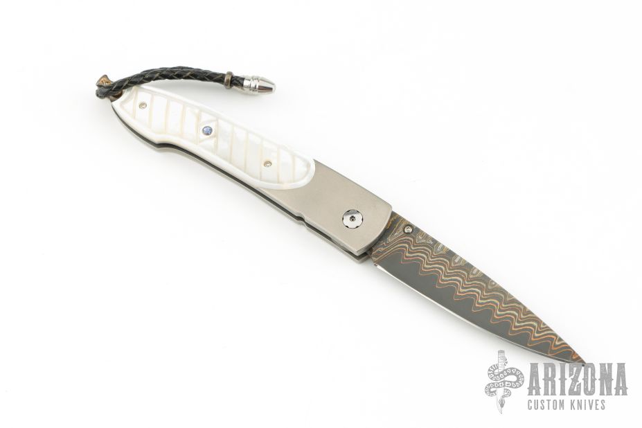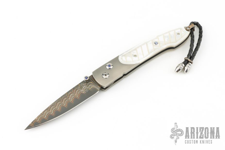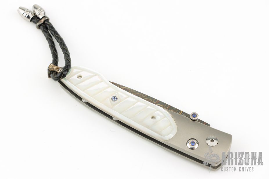 This William Henry is about style and performance. Sleek, light, tough, and elegant. The blade is made from Copper Wave VG-5 Core San Mai Damascus with corundum sapphire inset with gold bezel in the thumb stud and button lock. The handle has a bead blasted titanium frame with stainless standoffs, and hand carved mother of pearl covers with colored sapphire inlays. Very nice work. Comes with original box, sheath, and COA dated March 18, 2014. Excellent condition.