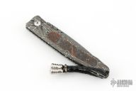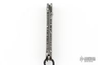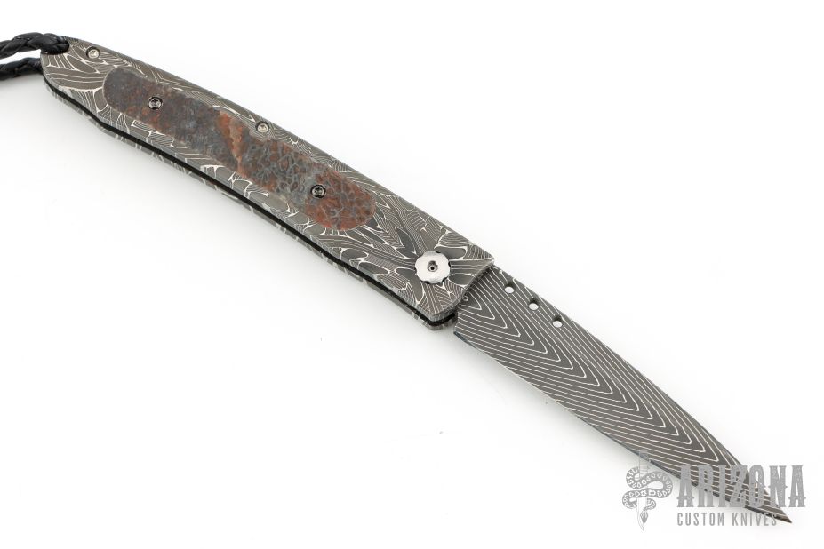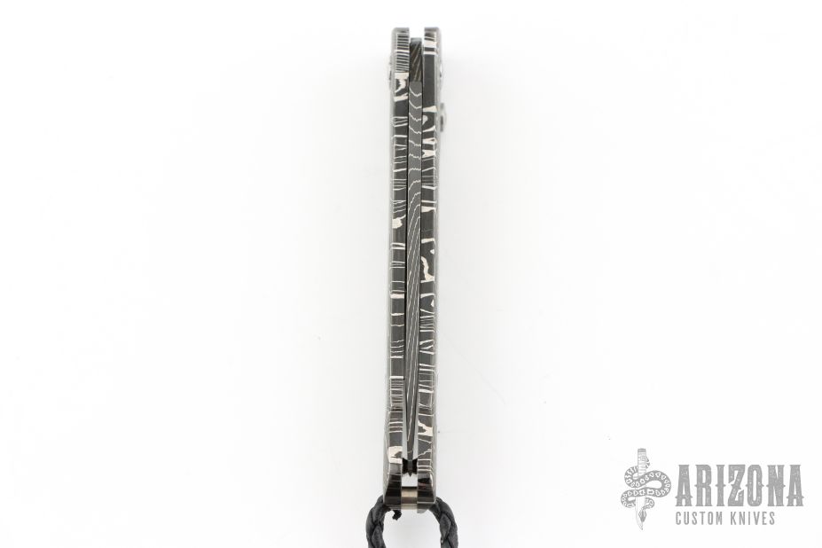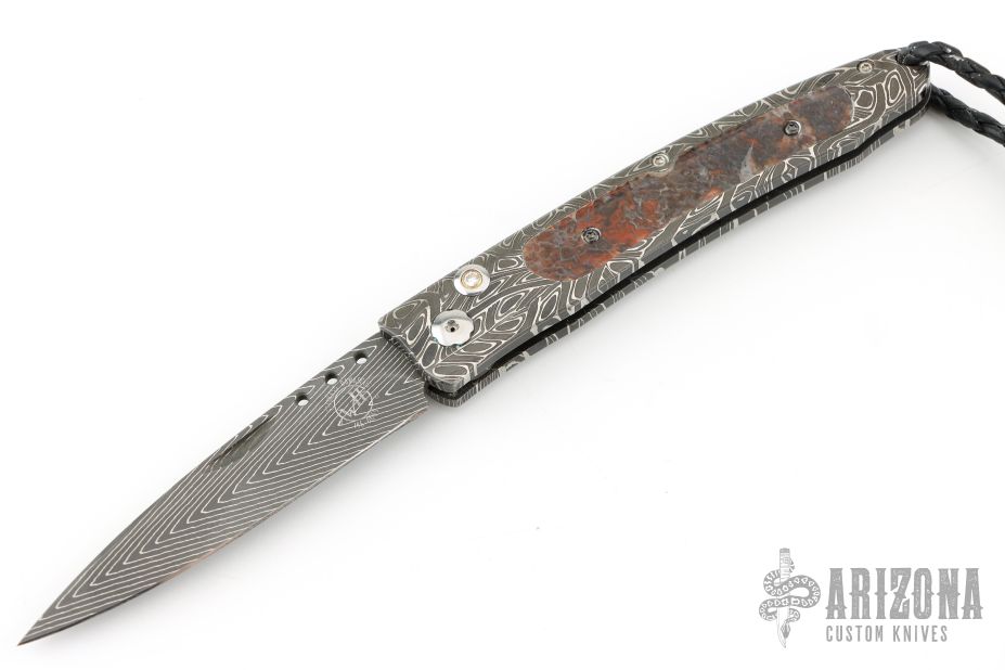 This B06 Quarterly One of a Kind by William Henry features a Rob Thomas Herring bone Damascus blade with nail nick. The handle has a Chad Nichols Carbon Damascus frame with Dinosaur bone inlays, diamond inlay in push button. Comes with black leather pocket sheath, original box and COA dated June 16, 2014. Excellent condition. One of a kind. #61408