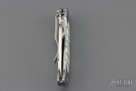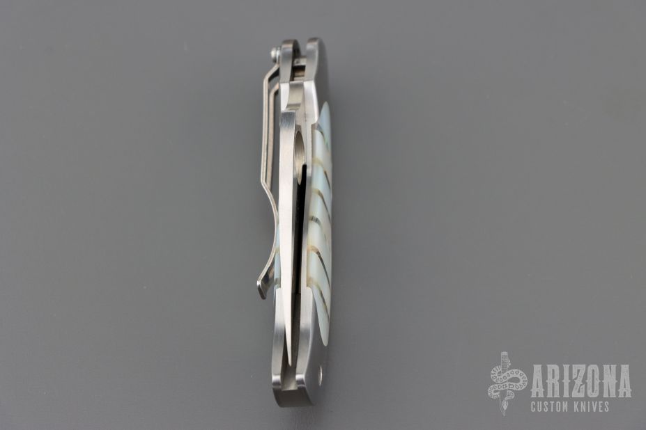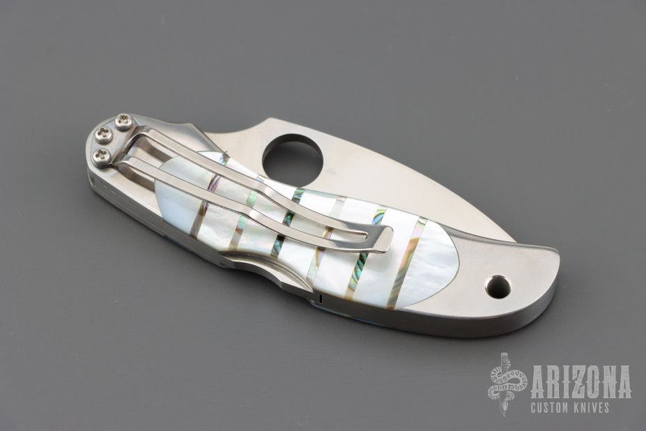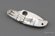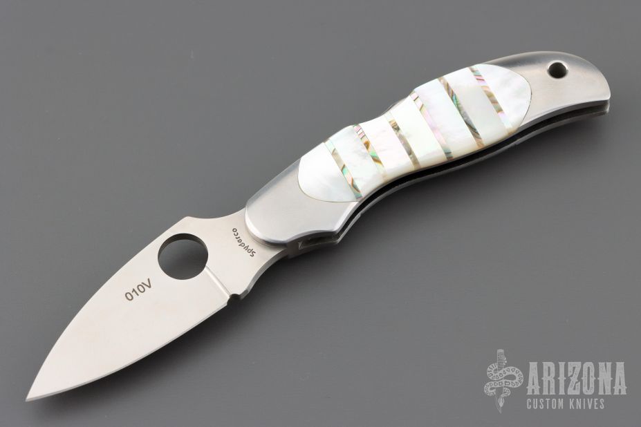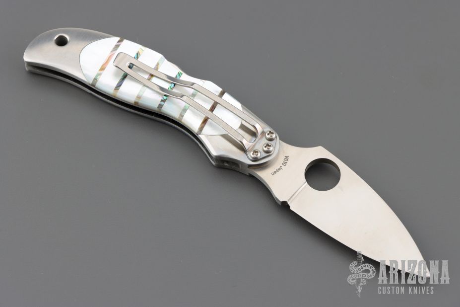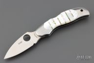 This lock back folding knife by Spyderco features a satin finish VG10 blade, and stainless steel double bolsters. Nice mother of pearl and abalone inlays. Stainless steel clip, tip down carry. Excellent condition. Includes original box and paperwork, one of 600.