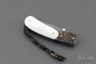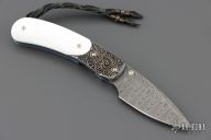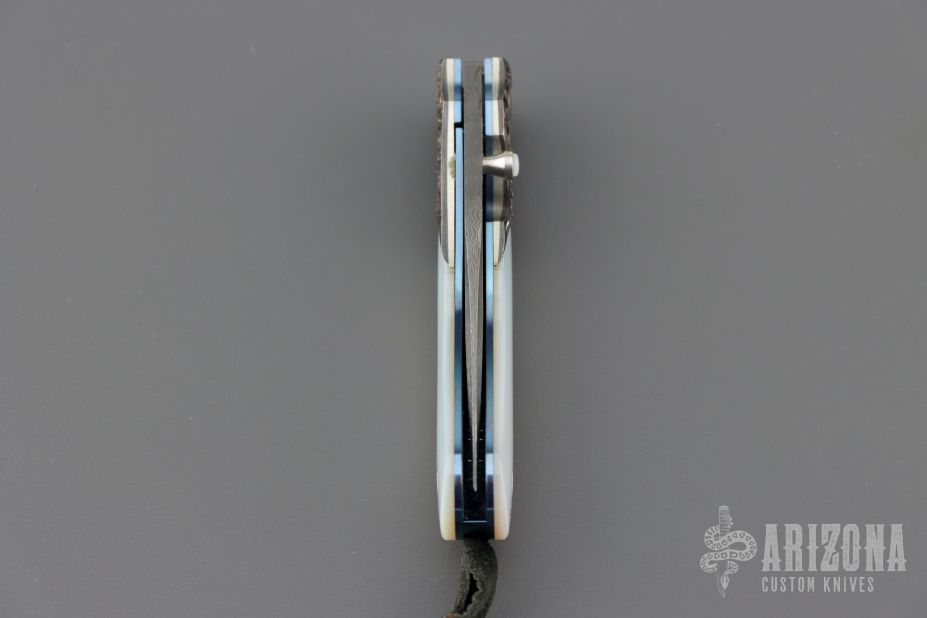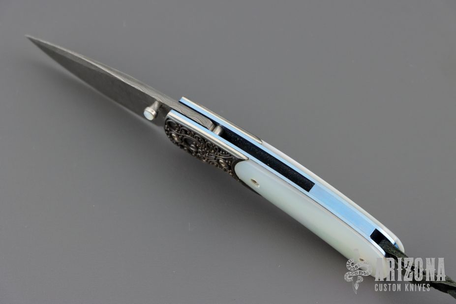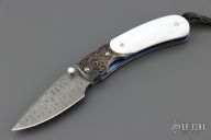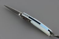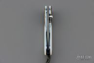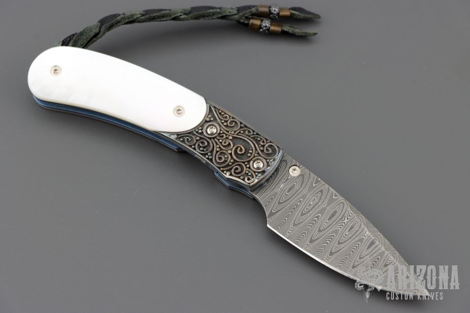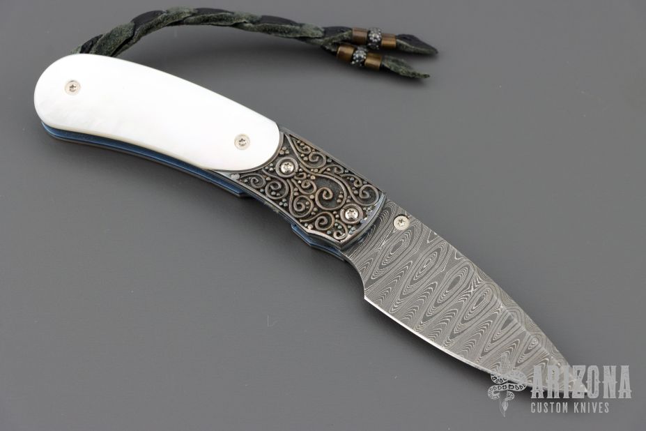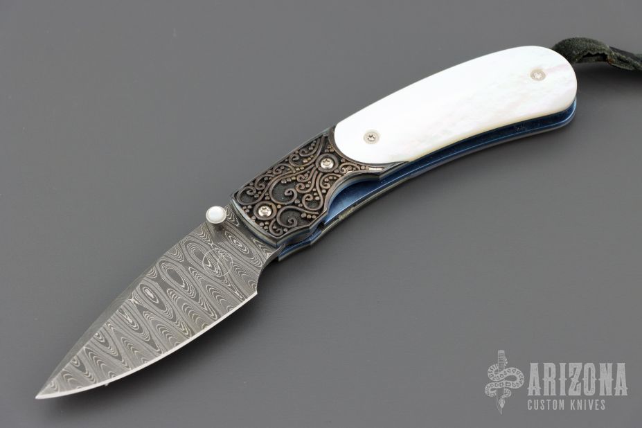 This B09 Cascade Linerlock by William Henry features a Stainless Damascus blade with single thumbstud with a Mother of pearl inset. The handle has sterling silver bolsters, mother of pearl inlays, anodized titanium liners and backspacer. Comes with original box, leather sheath and COA. Excellent condition.