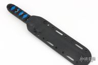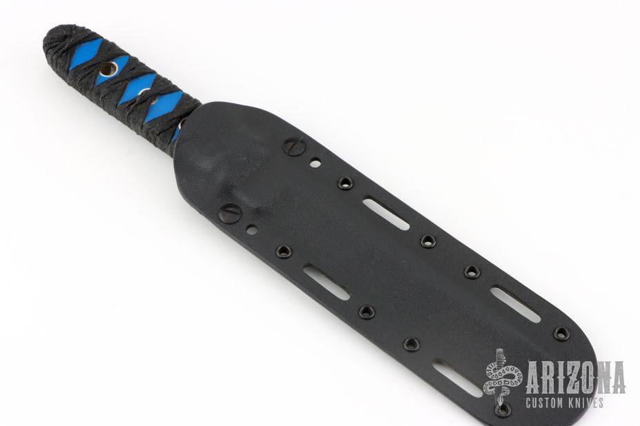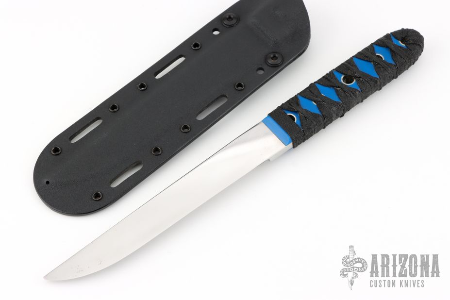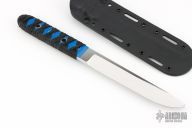This knife by Shane Sibert features a mirror-polished chisel ground blade with a full tang construction. .258" Blade Stock. 1.050" Blade Depth. The handle has blue G-10 scales with epoxy wrap. Includes a Kydex sheath. Excellent Condition.
