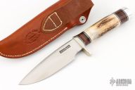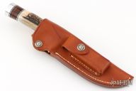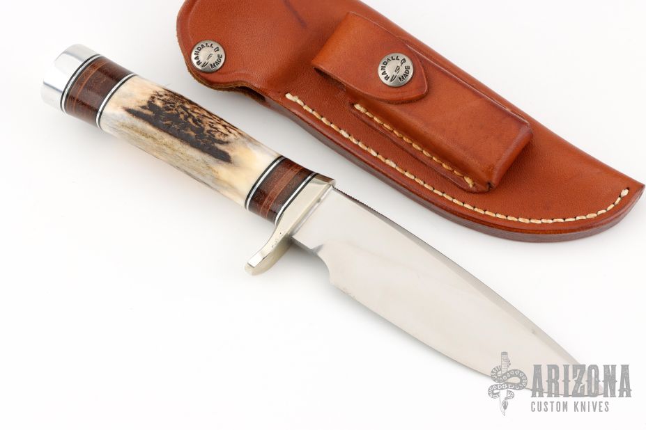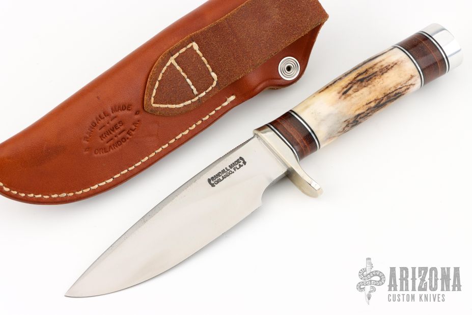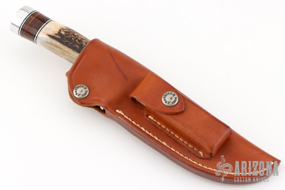 The Model 25-5 by Randall Made Knives is a drop point hunter similar to Model 11, but handle construction is reminiscent of 1930′s design. Excellent skinning, outdoors knife. This knife has a satin finished blade with notched thumbrest, .211" blade stock and 1.325" blade depth, hidden tang construction. The handle nickel guard and duralumin pommel, stag grip with stacked leather, black and duralumin spacers. Comes with a brown leather sheath. Excellent condition.