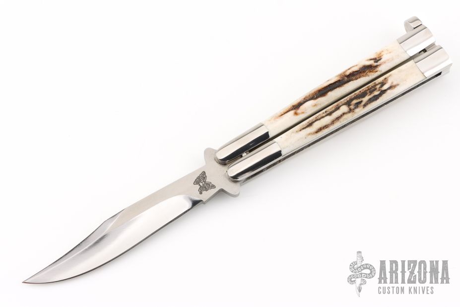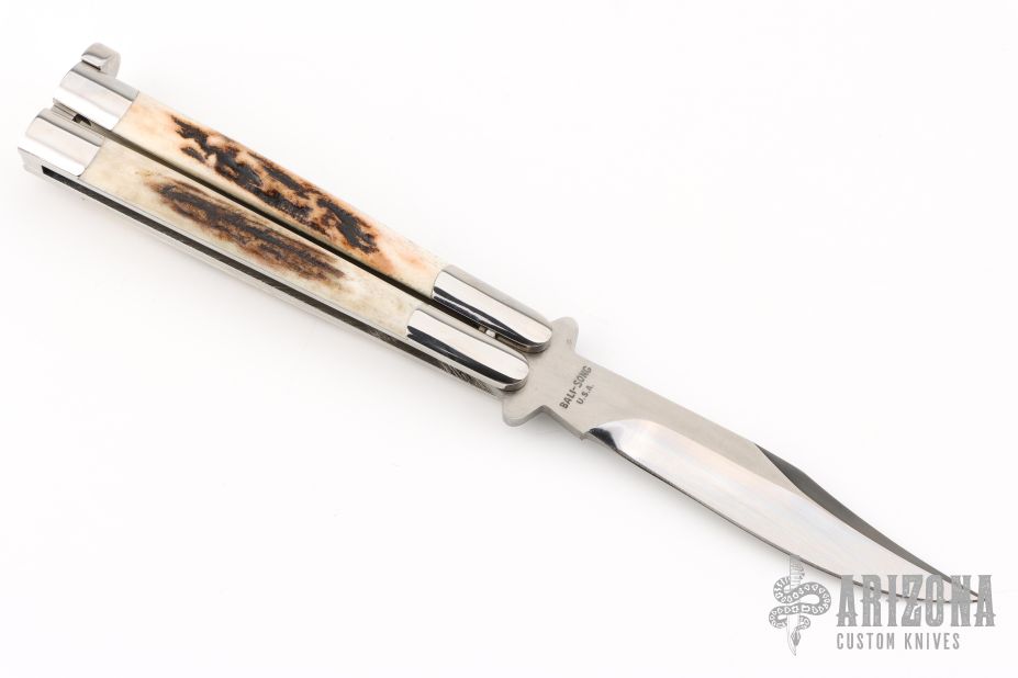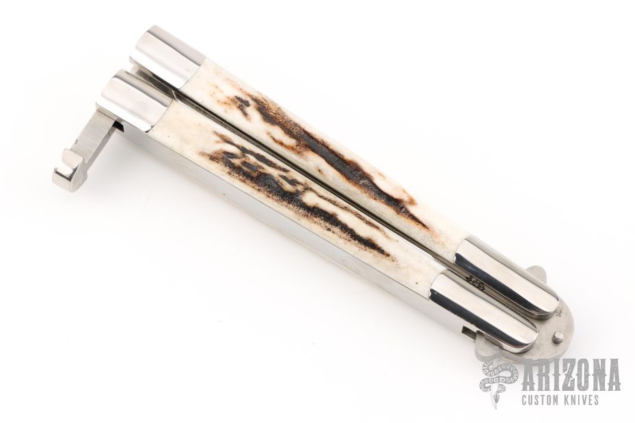 This early balisong from Pacific Cutlery features a Jody Samson ground satin finished blade with long clip bowie shaped blade. The handles are stainless steel with stag inlays, has t-latch. Excellent condition. Comes with original box and black leather sheath.