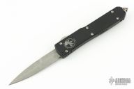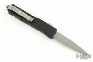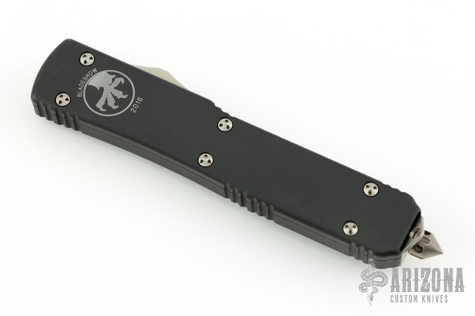 This knife from Microtech was the 2016 Blade Show Special. It has a single edged bayonet blade with an Apocalyptic finish. The handle is black aluminum with a tip down bead blasted stainless clip and glass breaker at the butt. Comes with original box and papers. From 2016 Blade Show. Excellent condition.