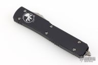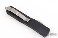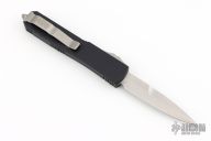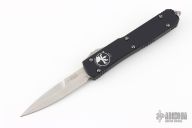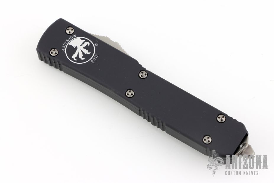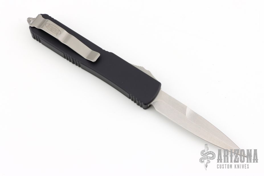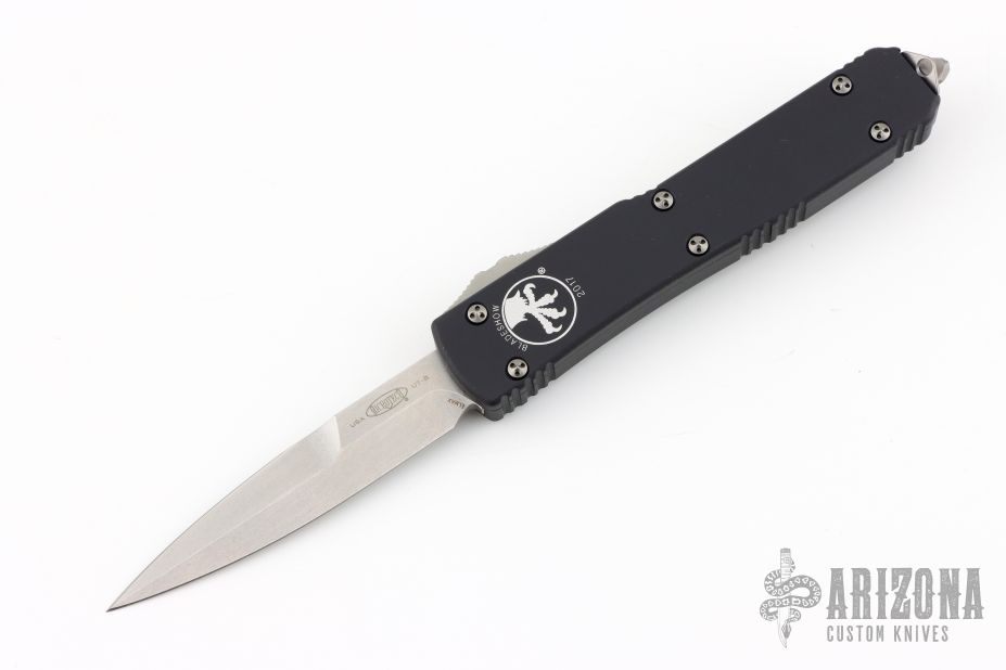 This knife from Microtech was the 2017 Blade Show Special. It has a double edged bayonet ground blade with a stonewash finish. The handle is black aluminum with a tip down bead blasted stainless clip and glass breaker at the butt. From 2017 Blade Show. Excellent condition.