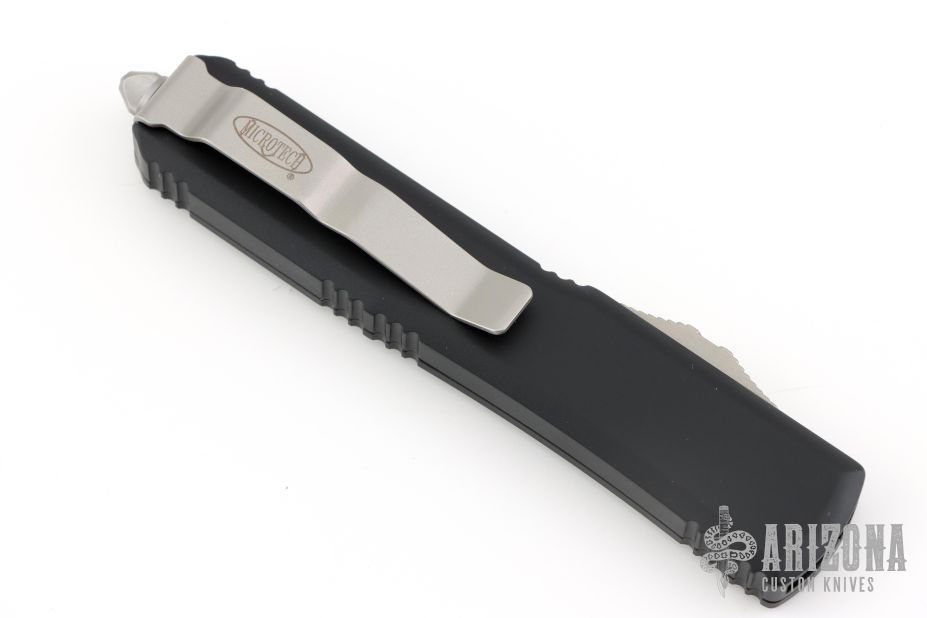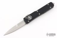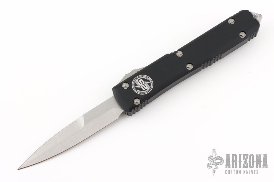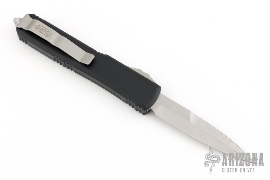 This Ultratech by Microtech is the 2019 Blade Show Special. It features a bayonet ground double-edged stonewashed blade. The handle has a black aluminum frame with blasted stainless hardware and tip up clip. Comes with a Microtech box, silver coin and papers. Excellent condition.