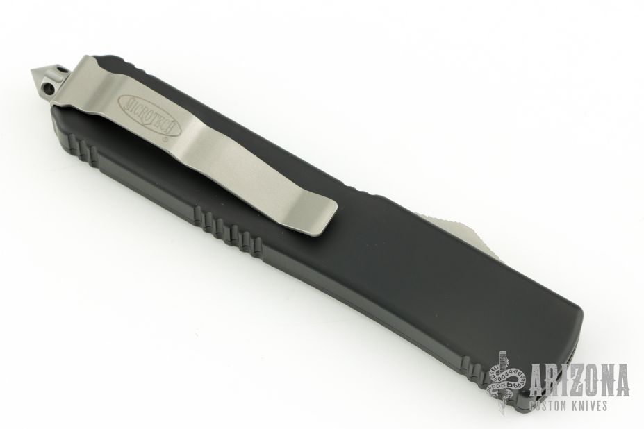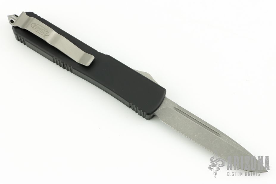 This knife from Microtech was the 2016 Blade Show Special. It has a single edged drop point blade with an Apocalyptic finish. The handle is black aluminum with a tip down bead blasted stainless clip and glass breaker at the butt. Comes with original box and papers. From 2016 Blade Show. Excellent condition.