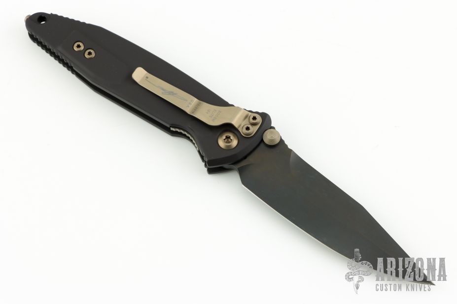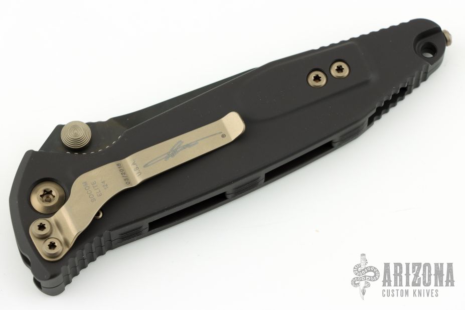 This Socom Elite from Microtech has a DLC blade with dual thumbstuds and notched thumbrest. The handle has a black aluminum frame with non-slip rubber inserts and a tip down bronzed stainless steel clip. Dated 03/2018 and S/N 124. Includes original box and paperwork. Excellent condition.